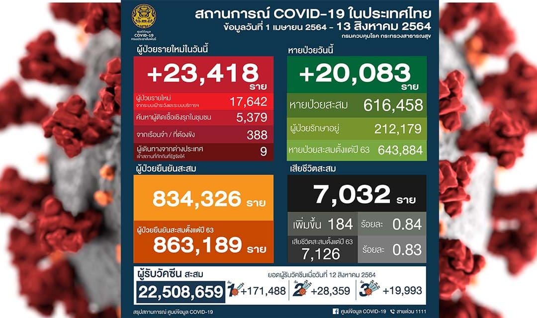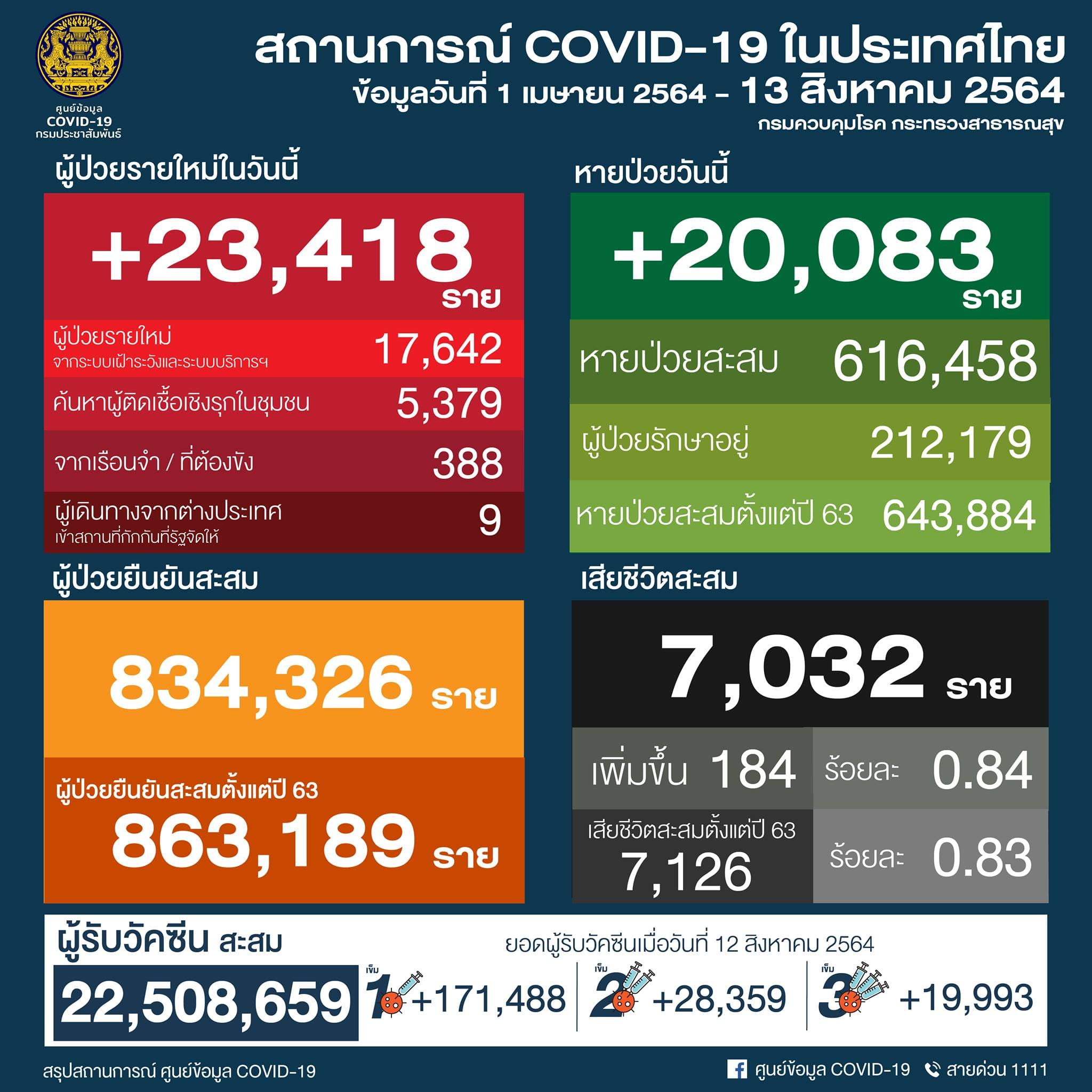 สถานการณ์แพร่ระบาดของโควิด-19 ประจำวัน ศูนย์บริหารสถานการณ์การแพร่ระบาดของโรคติดเชื้อไวรัสโคโรนา 2019 หรือ ศบค. รายงานสถานการณ์การแพร่ระบาดของโรคติดเชื้อ ไวรัสโคโรนา 2019 ล่าสุด วันที่ 13 ส.ค. 64 ภาพรวมของการระบาดยังต้องคอยเฝ้าระวังอย่างใกล้ชิด หลังพบผู้ติดเชื้อโควิด-19 รายใหม่อีก 23,418 ราย แบ่งเป็น ผู้ติดเชื้อรายใหม่ 23,030 ราย และผู้ติดเชื้อในเรือนจำ 388 ราย ทำให้มียอดผู้ป่วยยืนยันสะสมแล้วจนถึงวันนี้ 863,189 ราย อีกทั้งยังมียอดผู้เสียชีวิตอย่างต่อเนื่อง