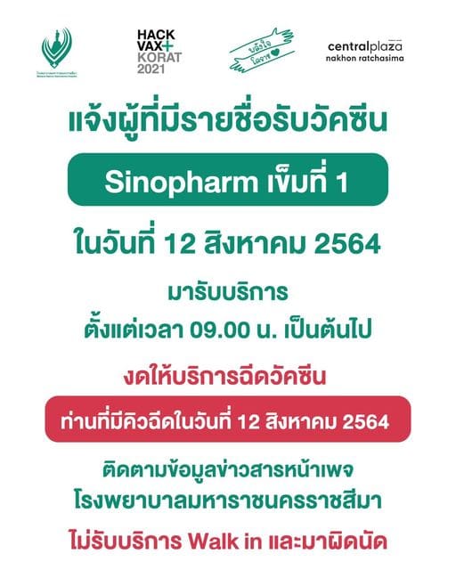 ซึ่งกลุ่มเป้าหมายของ รพ.มหาราชฯ ผู้ที่มีคิวฉีดวัคซีนซิโนฟาร์ม ในวันที่ 11-13 สิงหาคม 2564 ให้ไปรับบริการได้ที่จุดฉีดวัคซีนโคราชฮอลล์ ชั้น 4 ศูนย์การค้าเซ็นทรัลพลาซ่านครราชสีมา แต่ห้ามเลื่อนวันนัดเองโดยเด็ดขาด และผู้ที่มีรายชื่อรับวัคซีนซิโนฟาร์ม เข็มที่ 1 ในวันนี้ (12 สิงหาคม 2564 ) ให้ไปรับบริการตั้งแต่เวลา 09.00 น. เป็นต้นไป ส่วนผู้ที่มีคิวฉีดวัคซีนสูตรสลับ ซิโนแวค เข็มที่ 1 และแอสตร้าเซเนก้า เข็มที่ 2 ในวันนี้เช่นกัน ทาง รพ.มหาราชฯ ของดให้บริการไปก่อน และงดรับวอล์คอิน หรือผู้ที่มาผิดนัด