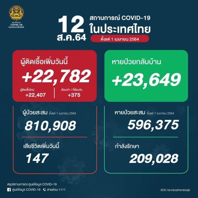 สถานการณ์แพร่ระบาดของโควิด-19 ประจำวัน ศูนย์บริหารสถานการณ์การแพร่ระบาดของโรคติดเชื้อไวรัสโคโรนา 2019 หรือ ศบค. รายงานสถานการณ์การแพร่ระบาดของโรคติดเชื้อ ไวรัสโคโรนา 2019 ล่าสุด วันที่ 12 ส.ค. 64 ภาพรวมของการระบาดยังต้องคอยเฝ้าระวังอย่างใกล้ชิด หลังพบผู้ติดเชื้อโควิด-19 รายใหม่อีก 22,782 ราย แบ่งเป็น ผู้ติดเชื้อรายใหม่ 22,407 ราย และผู้ติดเชื้อในเรือนจำ 375 ราย ทำให้มียอดผู้ป่วยยืนยันสะสมแล้วจนถึงวันนี้ 839,771 ราย อีกทั้งยังมียอดผู้เสียชีวิตอย่างต่อเนื่อง