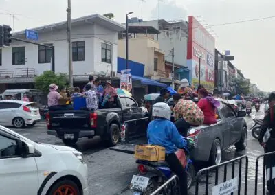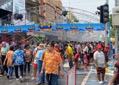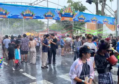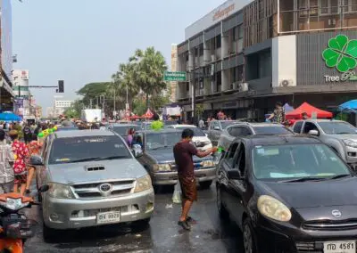 นอกจากนี้บริเวณถนนโดยรอบอนุสาวรีย์ท้าวสุรนารี ก็พบว่าประชาชนจำนวนมากต่างนำภาชนะใส่น้ำทั้งถังน้ำโอ่งน้ำขนขึ้นใส่รถกระบะออกมาเล่นน้ำสงกรานต์กันเป็นจำมากจนทำให้ถนนจอมสุรางค์เต็มไปด้วยรถยนต์และประชาชนที่พากันออกมาเล่นน้ำสงกรานต์เป็นวันแรก นอกจากประชาชนที่ออกมาเล่นน้ำสงกรานต์แล้วนั้นบรรดาร้านขายของริมทางต่างก็พากันขนข้าวของออกมาขาย ทั้งอาหารและอุปกรณ์ในการเล่นสงกรานต์ เช่น ขันน้ำ ดินสอพอง ซองกันน้ำ เป็นต้น