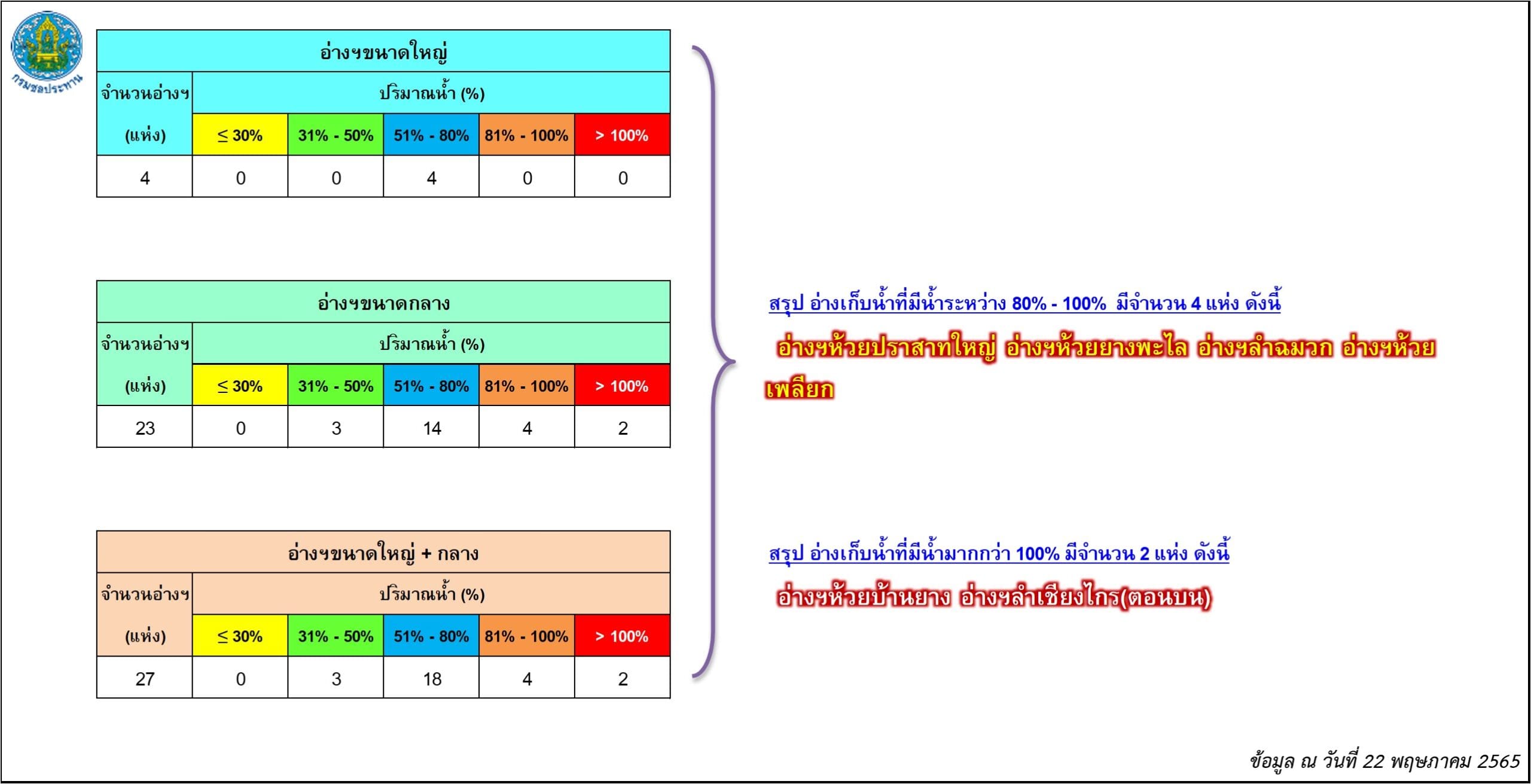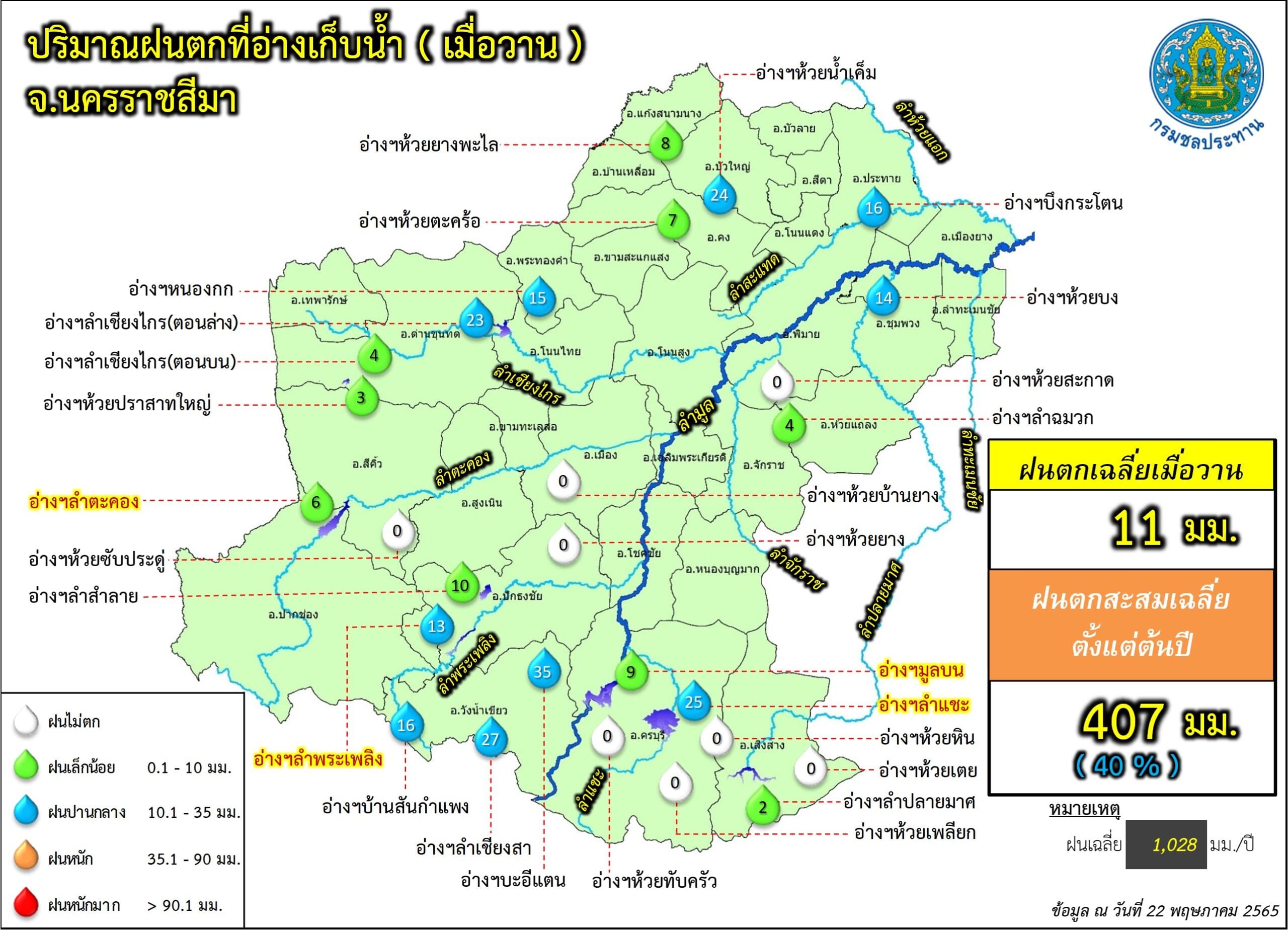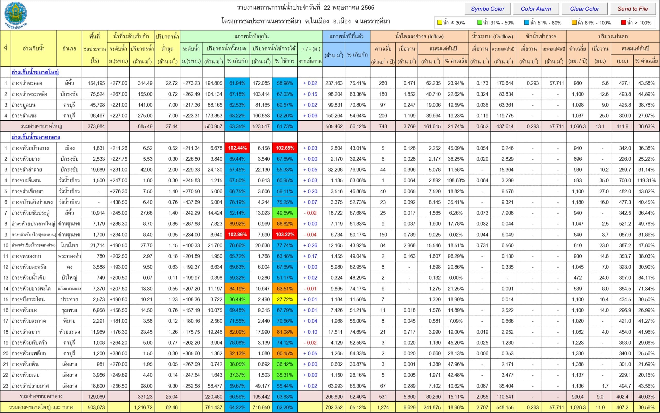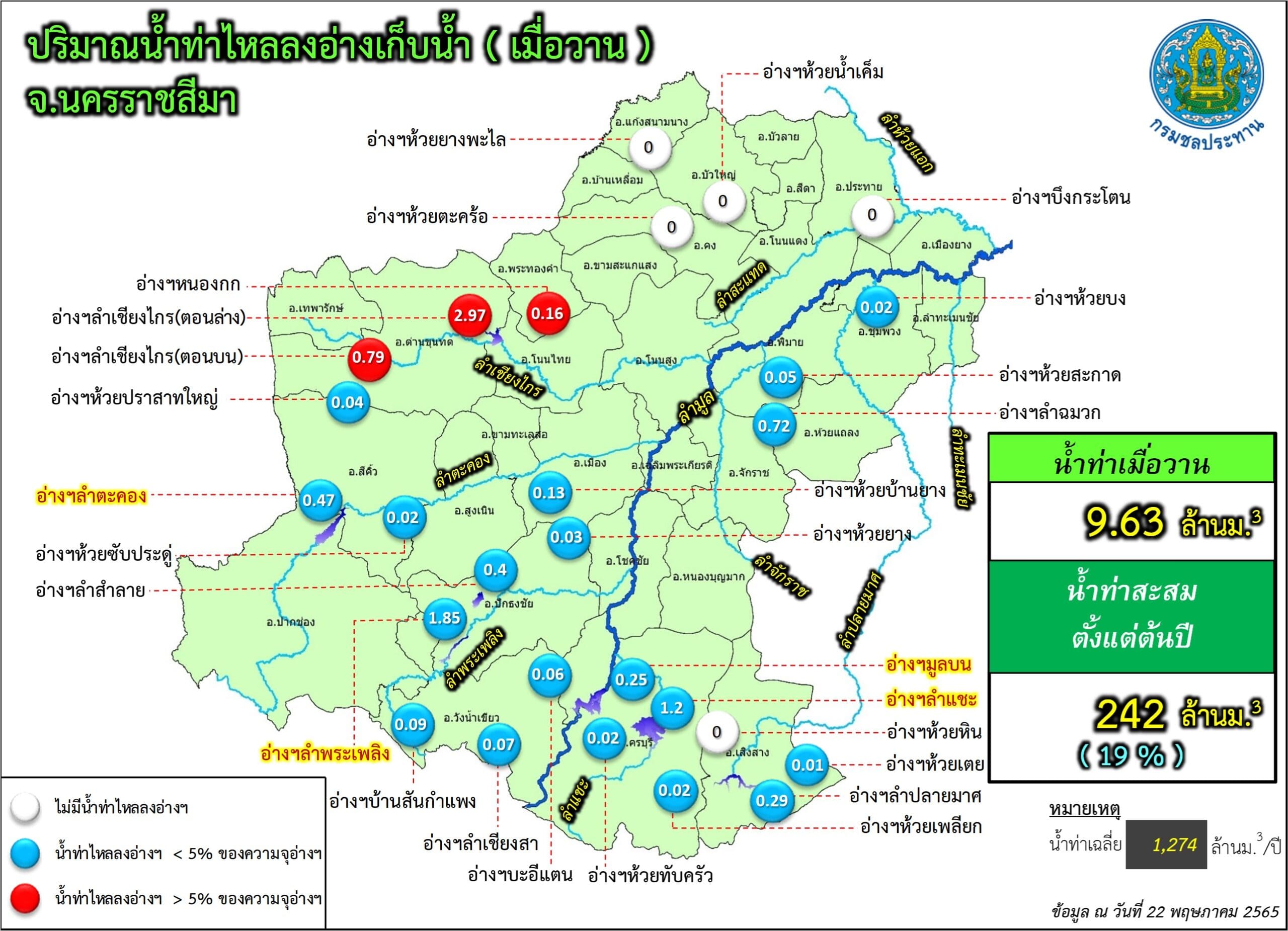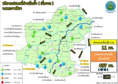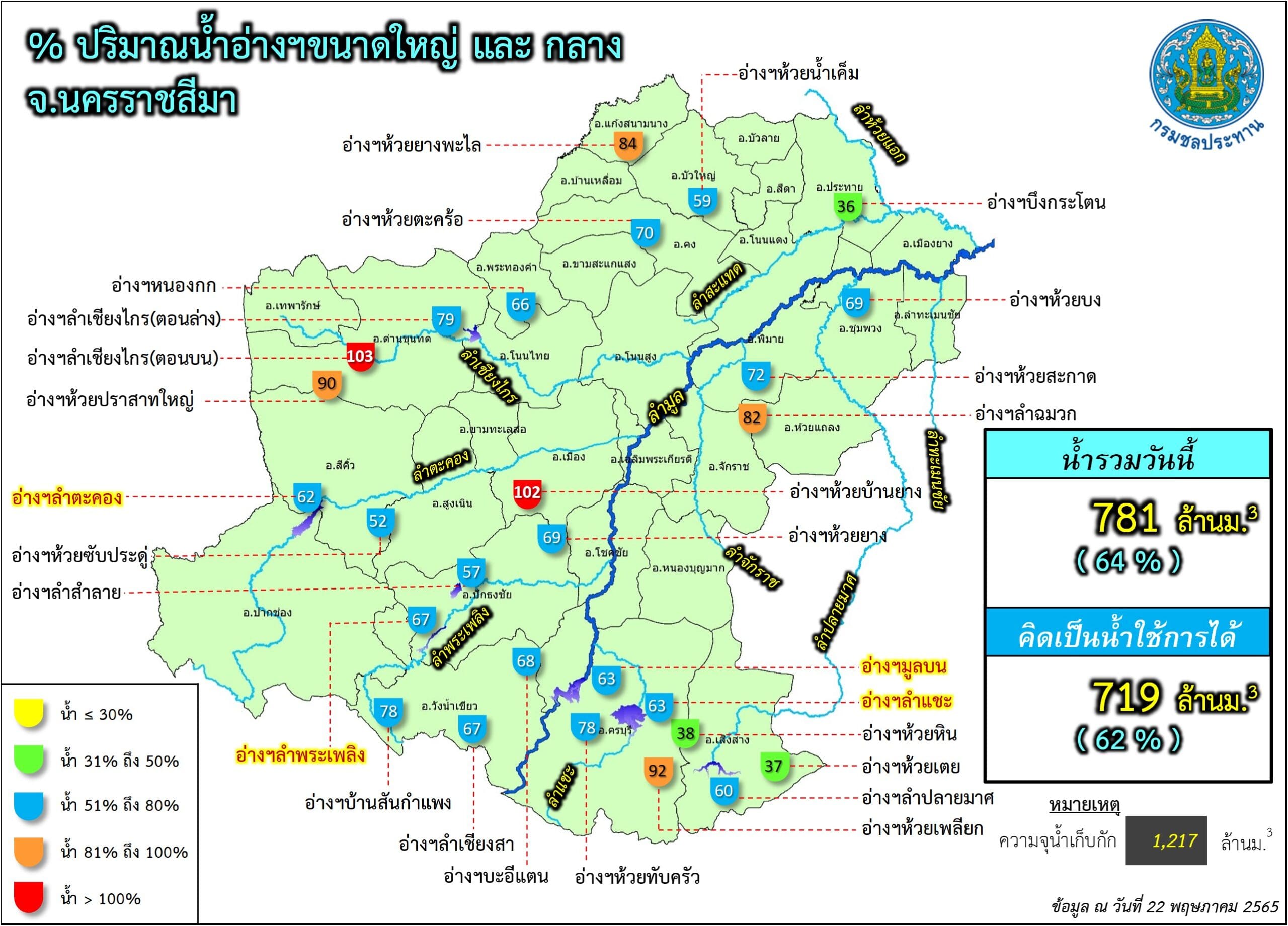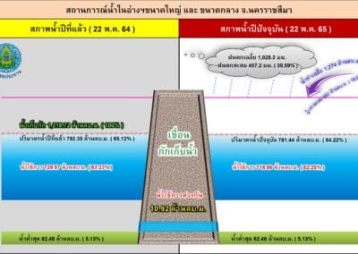 ขณะเดียวกันสำนักงานชลประทานจังหวัดนครราชสีมา เปิดเผยถึงสถานการณ์น้ำในอ่างเก็บน้ำขนาดใหญ่ ขนาดกลาง และขนาดเล็ก ในพื้นที่ จ.นครราชสีมา ซึ่งมีอยู่ทั้งหมด 54 แห่ง พบว่าในวันนี้ (23 พ.ค.) มีปริมาณน้ำเกินความจุแล้ว 2 แห่ง ซึ่งเป็นอ่างเก็บน้ำขนาดกลางทั้งหมด ได้แก่ อ่างเก็บน้ำลำเชียงไกรตอนบน อ.ด่านขุนทด มีปริมาณน้ำในอ่าง 8.64 ล้านลูกบาศก์เมตร คิดเป็นร้อยละ 102 ของความจุกักเก็บทั้งหมด 8.40 ล้านลูกบาศก์เมตร และอ่างเก็บน้ำห้วยบ้านยาง อ.เมืองนครราชสีมา มีปริมาณน้ำในอ่าง 6.67 ล้านลูกบาศก์เมตร คิดเป็นร้อยละ 102 ของความจุกักเก็บทั้งหมด 6.52 ล้านลูกบาศก์เมตร โดยทางสำนักงานชลประทานจังหวัดนครราชสีมา ได้ออกหนังสือประกาศแจ้งเตือนประชาชนที่อยู่บริเวณใต้อ่าง ให้เฝ้าระวังน้ำล้นตลิ่งคลองธรรมชาติอย่างใกล้ชิด เพราะช่วงนี้จะเร่งระบายน้ำออกจากอ่างต่อเนื่อง