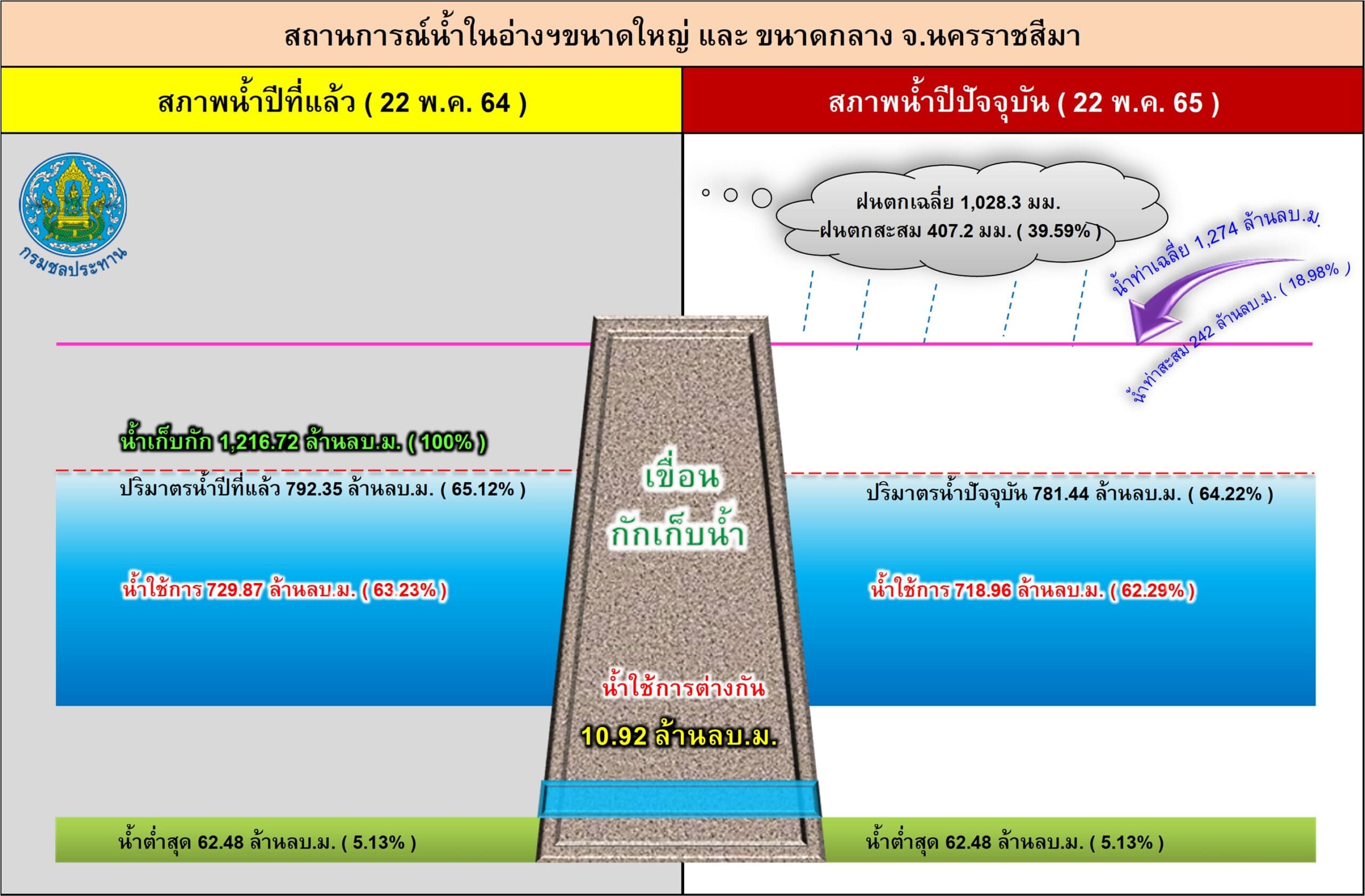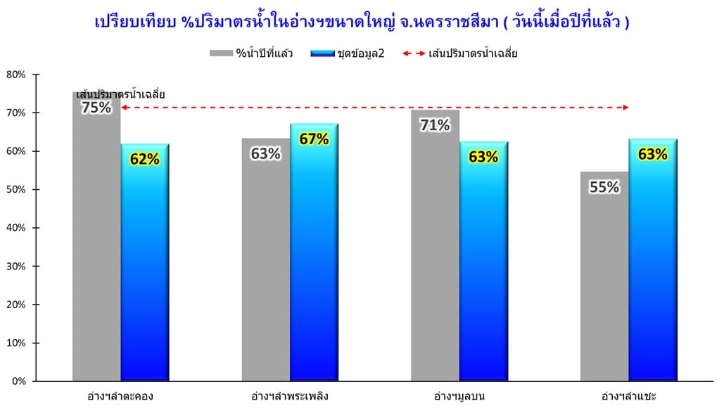 ขณะที่อ่างเก็บน้ำขนาดใหญ่ 4 แห่ง ได้แก่ อ่างเก็บน้ำลำตะคอง อ.สีคิ้ว, อ่างเก็บน้ำลำพระเพลิง อ.ปักธงชัย, อ่างเก็บน้ำมูลบน และอ่างเก็บน้ำชำแชะ อ.ครบุรี มีปริมาณน้ำกักเก็บอยู่ในอ่างเฉลี่ย 63.35% แม้ว่าช่วงนี้จะมีฝนตกลงมาอย่างต่อเนื่อง แต่ทางชลประทานจังหวัดนครราชสีมา ก็ยืนยันว่าสามารถรับน้ำได้อีกมาก โดยระยะนี้ได้มีการปล่อยน้ำลงสู่คลองธรรมชาติ เพื่อการเกษตรและการอุปโภคบริโภคของประชาชนต่อเนื่องเช่นกัน.