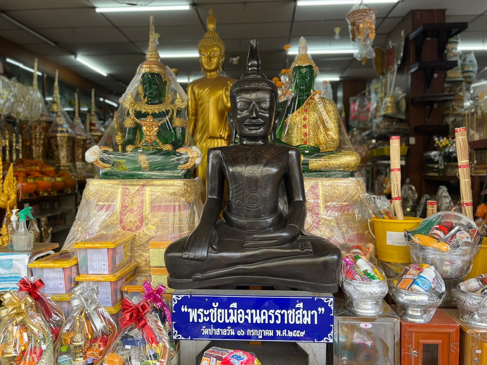 “พระชัยเมืองนครราชสีมา” ค้นพบที่เมืองพิมาย เป็นพระคู่บ้านคู่เมืองของจังหวัดนครราชสีมา เป็นพระพุทธรูปปางมารวิชัย ศิลปะอยุธยา พุทธศตวรรษที่ 19-20 ชนิดสำริด หน้าตักกว้าง 15.3 ซ.ม. สูง 22.2 ซ.ม. ประทับนั่งสมาธิราบบนฐานเตี้ย พระบาทขวาทับพระบาทซ้าย ครองจีวรห่มเฉียง ชายสังฆาฏิยาวสอดอยู่ใต้ชายรัดประคดพระพักตร์ สี่เหลี่ยม พระเนตรเบิกกว้าง กรอบพระพักตร์มีไรพระศกสองเส้น ขมวดพระเกศาเล็ก พระรัศมีทำเป็นรูปคล้ายหม้อน้ำแบบศิลปะที่เรียกว่า ‘พระพุทธรูปอู่ทอง 2’