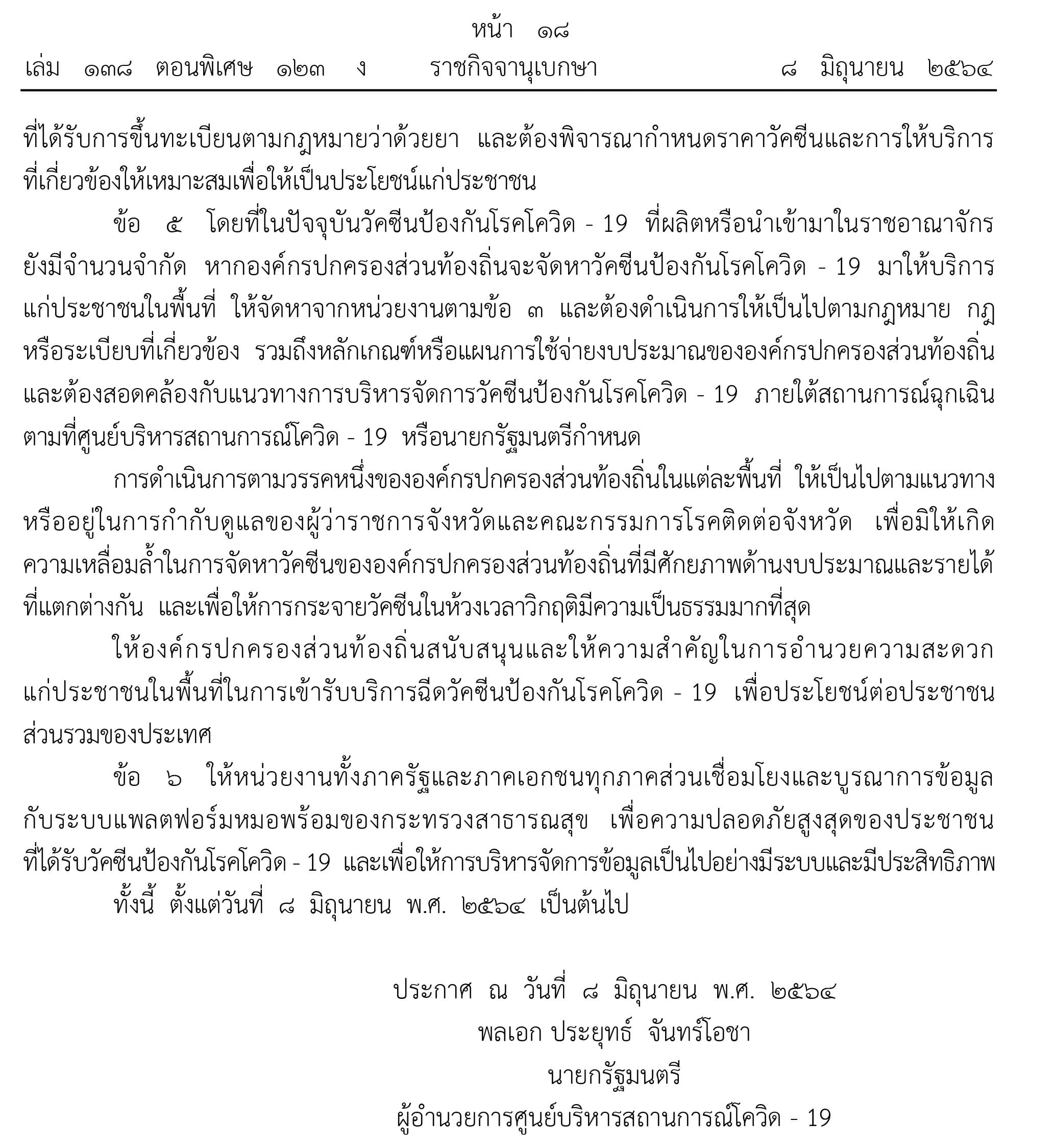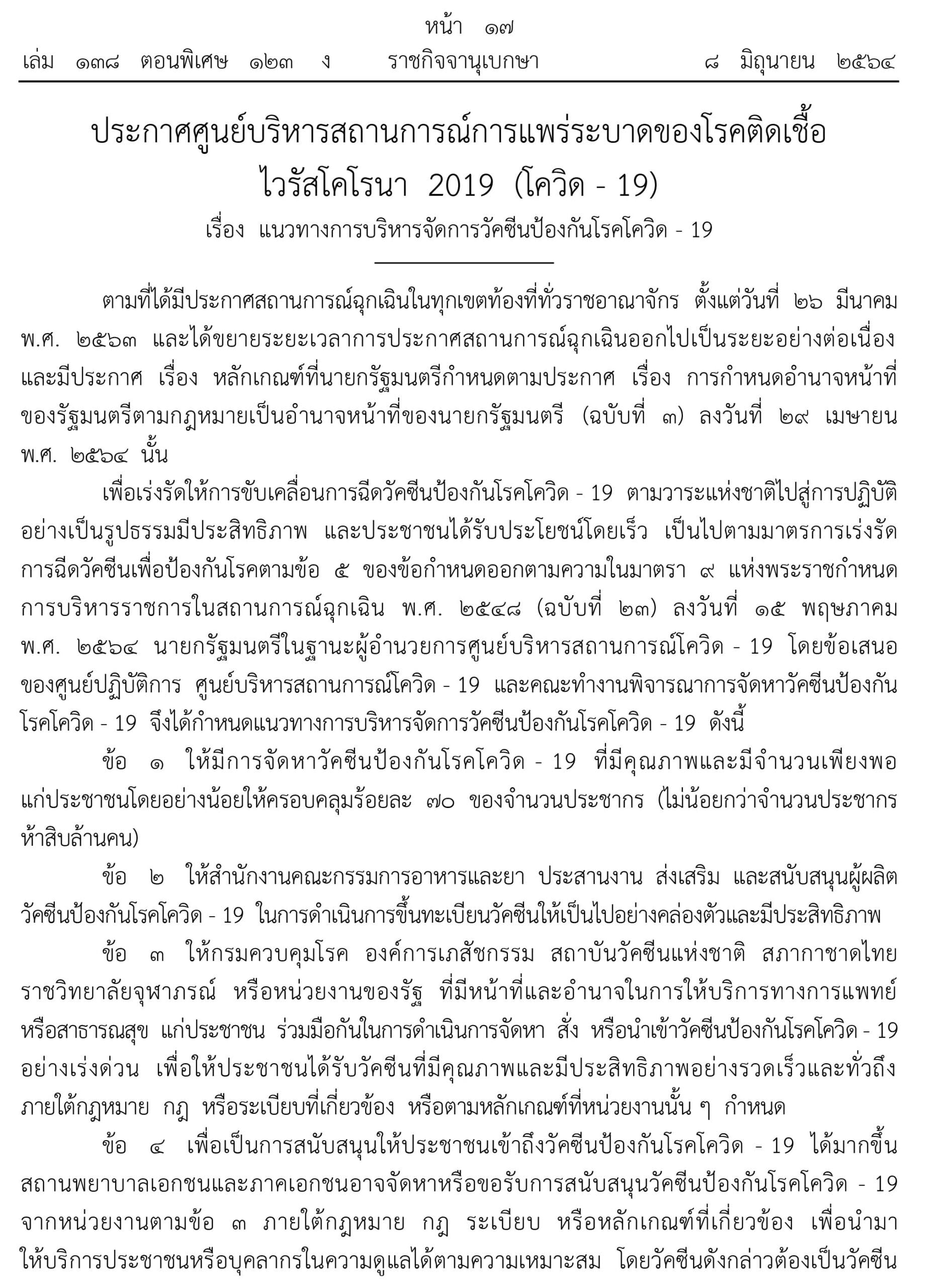 เมื่อวันที่ 8 มิถุนายน 2564 ราชกิจจานุเบกษา เผยแพร่ ประกาศศูนย์บริหารสถานการณ์การแพร่ระบาดของโรคติดเชื้อ ไวรัสโคโรนา 2019 (โควิด – 19 ) ศบค. เรื่อง แนวทางการบริหารจัดการวัคซีนป้องกันโรคโควิด – 19 ใจความสำคัญกำหนดแนวทางบริหารจัดการวัคซีนโควิด-19 จำนวน 6 ข้อ