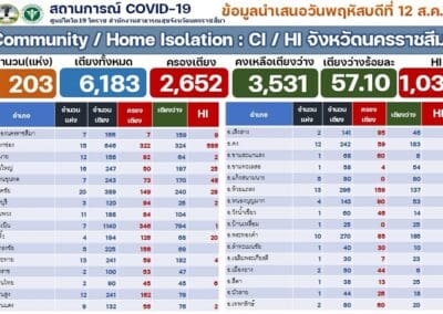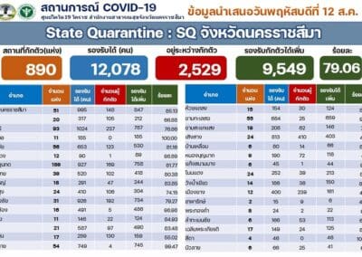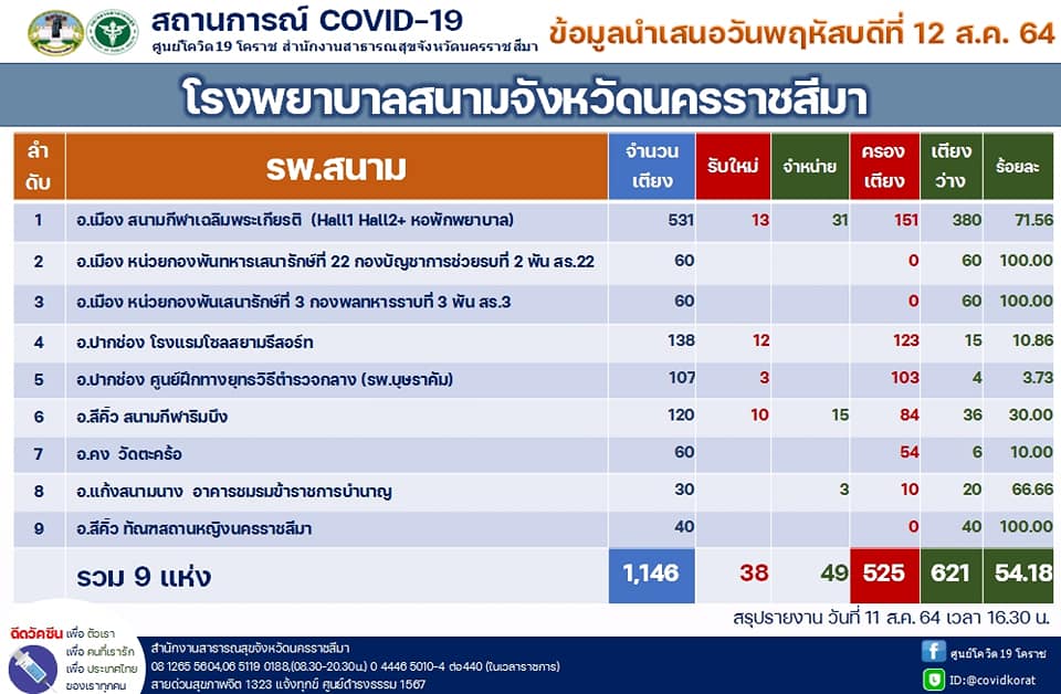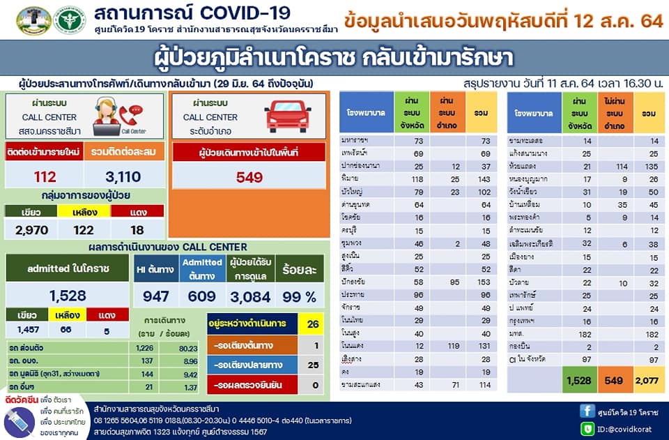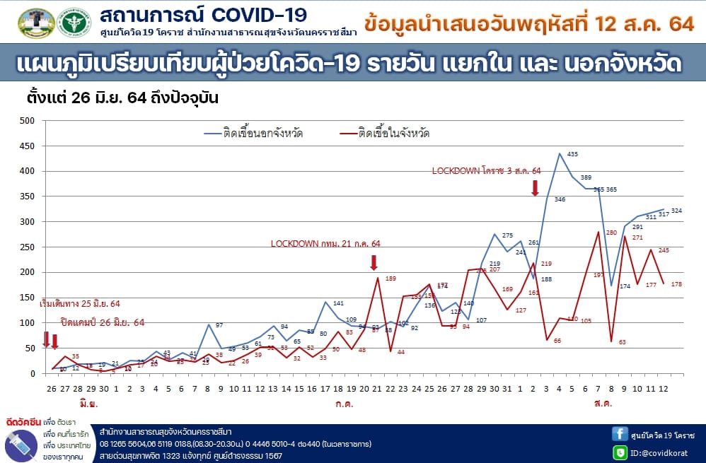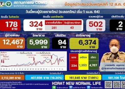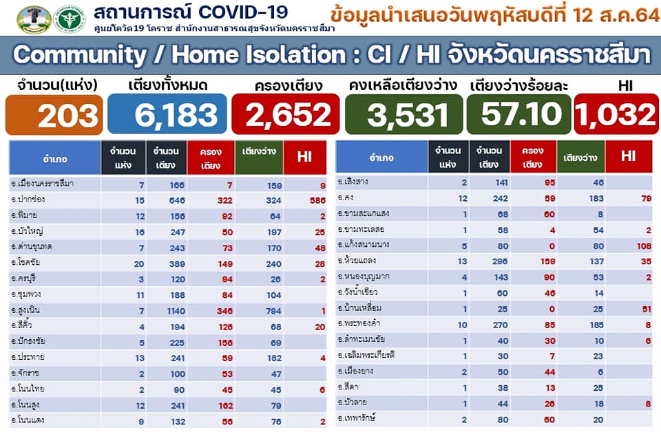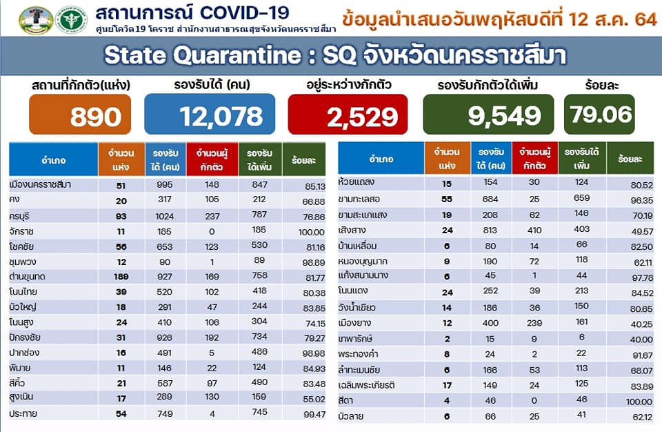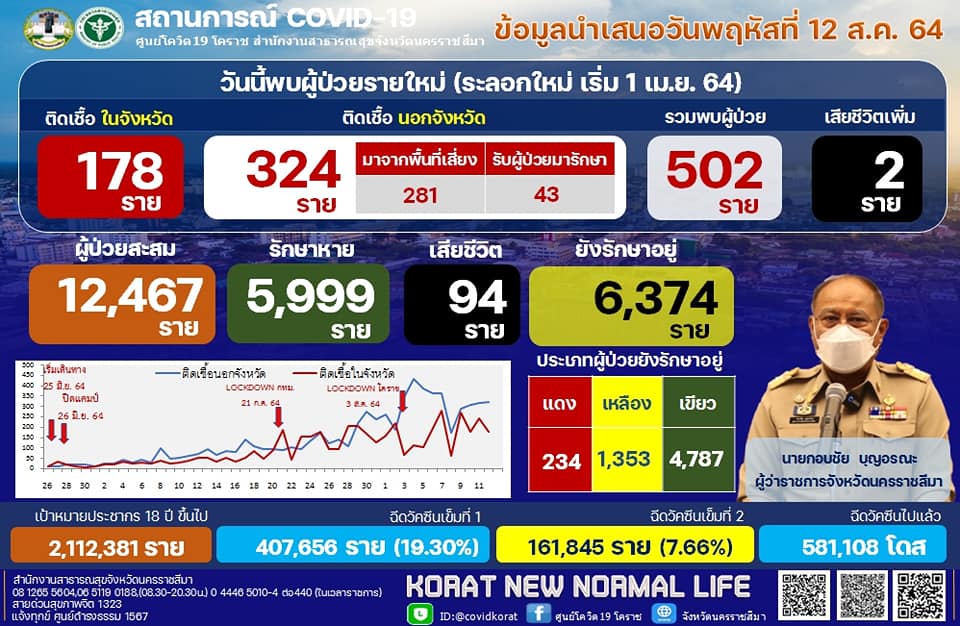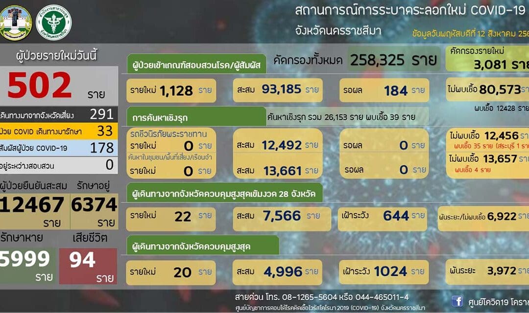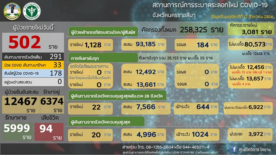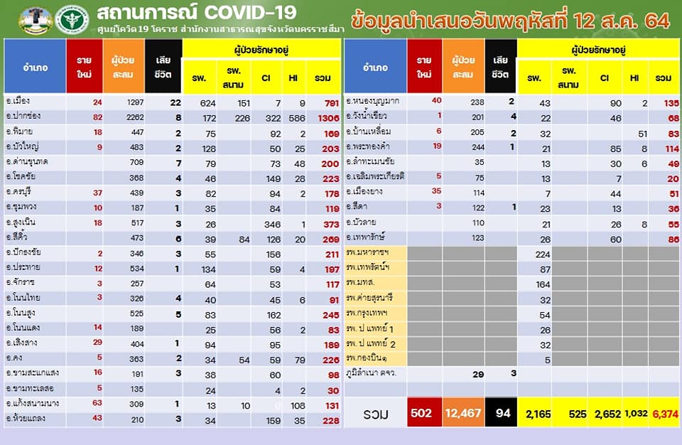 นครราชสีมา-ศูนย์โควิด 19 โคราช สำนักงานสาธารณสุขจังหวัดนครราชสีมา รายงานสถานการณ์การแพร่ระบาดของโรคติดเชื้อโควิด 19 ในพื้นที่จังหวัดนครราชสีมา วันนี้ (12 สิงหาคม 2564) ว่า พบผู้ติดเชื้อรายใหม่ 502 ราย ซึ่งเป็นการติดเชื้อในจังหวัด 178 ราย และติดเชื้อมาจากนอกจังหวัด โดยมาจากพื้นที่เสี่ยง 281 ราย และรับผู้ป่วยโควิด19 กลับมารักษา 43 ราย รวมเป็นติดเชื้อมาจากนอกจังหวัด จำนวน 324 ราย ทั้งนี้ ตั้งแต่ช่วงปลายเดือนกรกฎาคม 2564 เป็นต้นมา พบว่า ยอดติดเชื้อมาจากนอกจังหวัด จะมากกว่าการติดเชื้อกันเองในจังหวัด จึงทำให้ยอดผู้ป่วยสะสมมากถึง 12,467 รายแล้ว โดยรักษาหายแล้ว 5,999 ราย ส่วนที่ยังรักษาตัวอยู่ 6,374 ราย จะเป็นผู้ป่วยเคสสีแดง จำนวน 234 ราย เคสสีเหลือง 1,353 ราย และเคสสีเขียว จำนวน 4,787 ราย