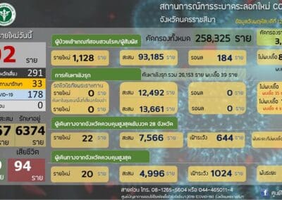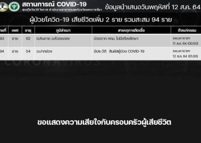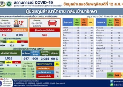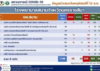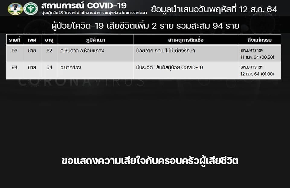 ในขณะที่มีรายงานการเสียชีวิตเพิ่ม 2 ราย ทำให้ยอดเสียชีวิตสะสมอยู่ที่ 94 ราย ซึ่งผู้เสียชีวิตรายที่ 93 เป็นเพศชายอายุ 62 ปี เป็นชาว ต.หินดาด อ.ห้วยแถลง ป่วยติดเชื้อมาจาก กรุงเทพฯ ไม่มีเตียงรักษา จึงขอกลับมาภูมิลำเนาที่ จ.นครราชสีมา และเข้ารับการรักษา ที่ รพ.มหาราชนครราชสีมา เสียชีวิตลงเมื่อวันที่ 11 สิงหาคม 2564 เวลา 00.50 น. ส่วนรายที่ 94 เป็นเพศชายอายุ 54 ปี เป็นชาว อ.ปากช่อง มีประวัติสัมผัสผู้ป่วยติดเชื้อโควิด 19 และได้เสียชีวิตที่ รพ.มหาราชนครราชสีมา เมื่อวันที่ 11 สิงหาคม 2564 เวลา 01.00 น.