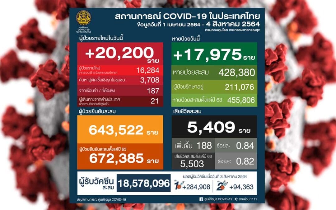 ศบค. รายงานสถานการณ์โควิดวันนี้ 4 ส.ค. 64 ผู้ติดเชื้อทุบสถิติ 20,200 รายใหม่ เสียชีวิตเพิ่ม 188 ศพ อยู่ระหว่างรักษาตัว 2.1 แสนราย อาการหนัก 4,893 ราย หายป่วยเพิ่ม 18,590 ราย