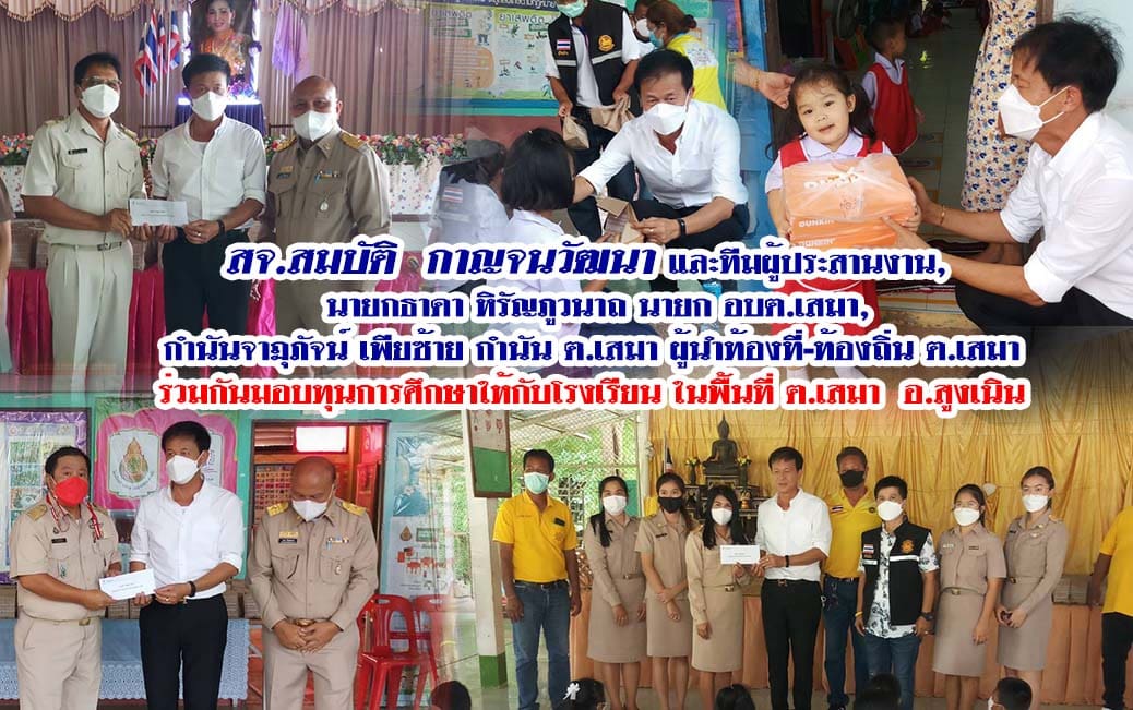 วันที่ 6 มิ.ย.2565 สจ.สมบัติ กาญจนวัฒนา และทีมผู้ประสานงาน, นายกธาดา หิรัญภูวนาถ นายก อบต.เสมา, กำนันจาฏุภัจน์ เพียซ้าย กำนัน ต.เสมา ผู้นำท้องที่-ท้องถิ่น ต.เสมา ร่วมกันมอบทุนการศึกษาให้กับโรงเรียน ในพื้นที่ ต.เสมา อ.สูงเนิน จำนวน 6 โรงเรียน ๆ ละ 5,000 บาท ดังนี้ :-