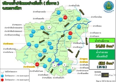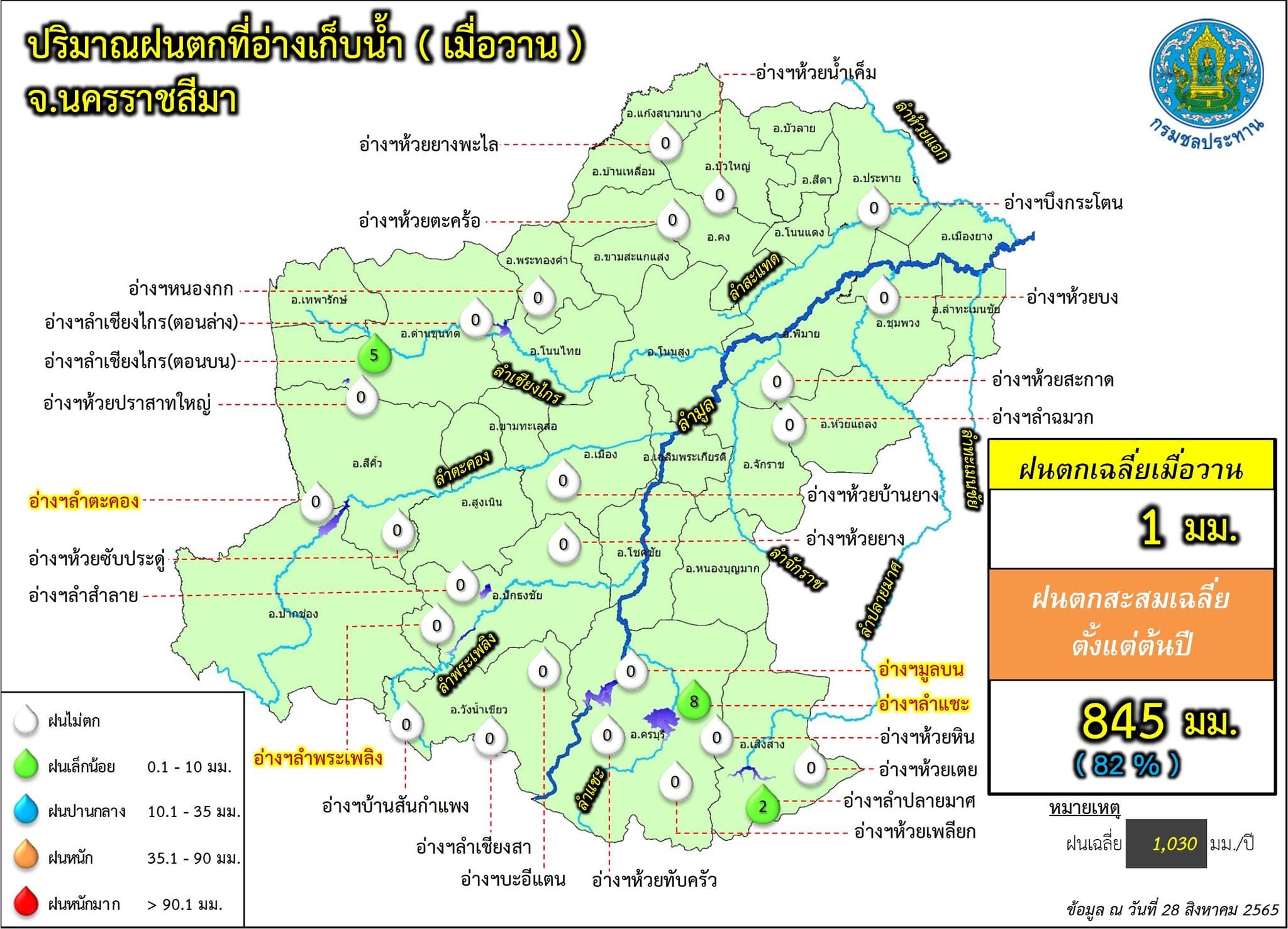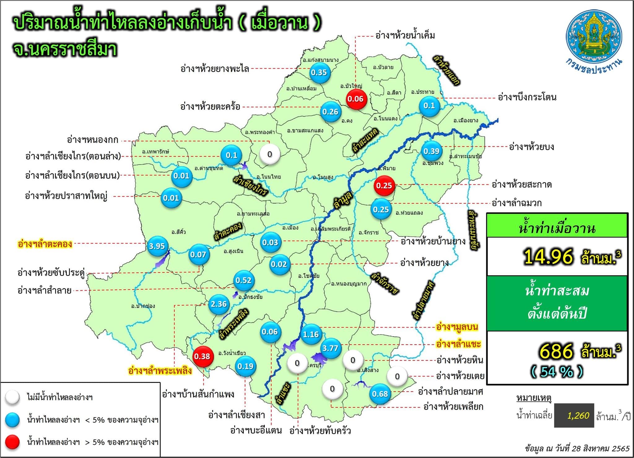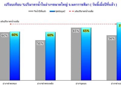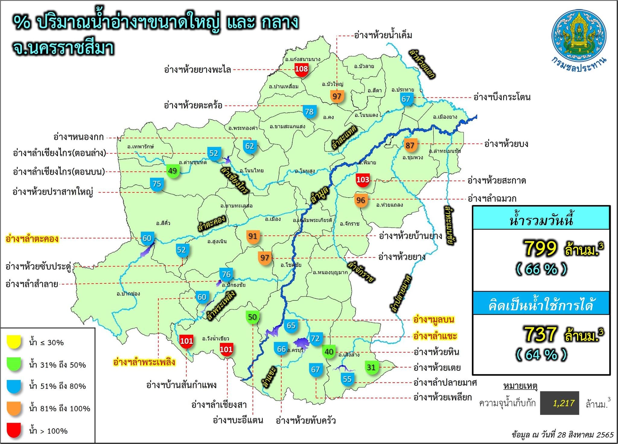 ขณะเดียวกันปริมาณน้ำในอ่างเก็บน้ำขนาดใหญ่ 4 แห่ง ในพื้นที่ จ.นครราชสีมา ได้แก่ อ่างเก็บน้ำลำตะทอง อ.สีคิ้ว, อ่างเก็บน้ำทำพระเพลิง อ.ปักธงชัย, อ่างเก็บน้ำลำแชะ อ.ครบุรี และอ่างเก็บน้ำมูลบน อ.ครบุรี มีปริมาณน้ำกักเก็บรวมกัน 571.558 ล้านลูกบาศก์เมตร คิดเป็นร้อยละ 64.55 ของความจุกักเก็บทั้งหมด 885.49 ล้านลูกบาศก์เมตรเท่านั้น จึงไม่น่าเป็นห่วงอะไร ยังสามารถรับน้ำได้อีกในปริมาณมาก.