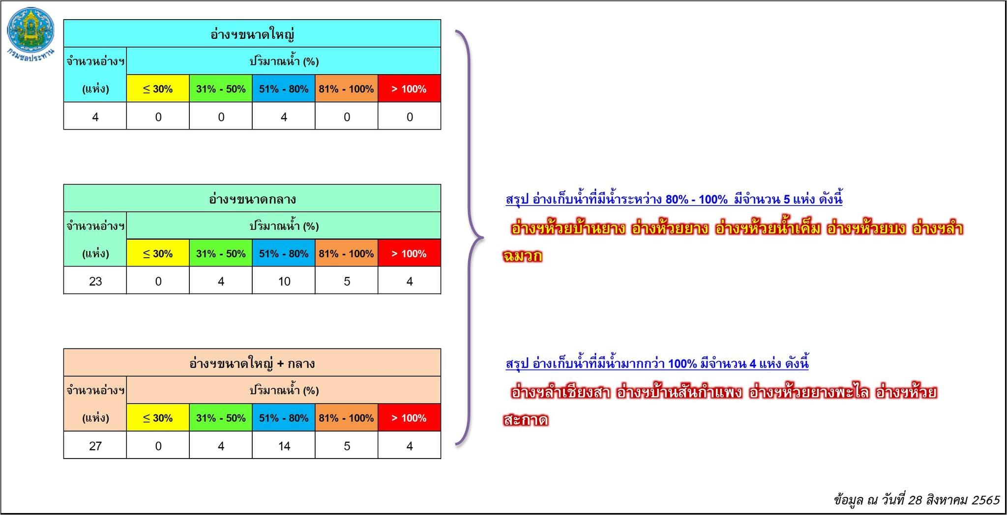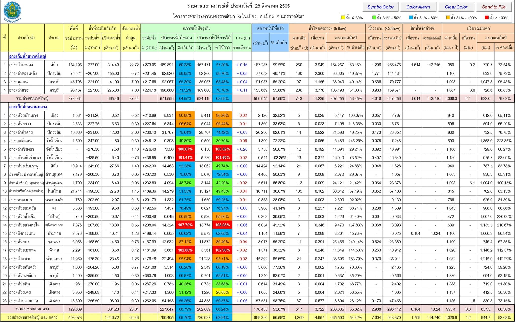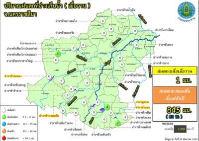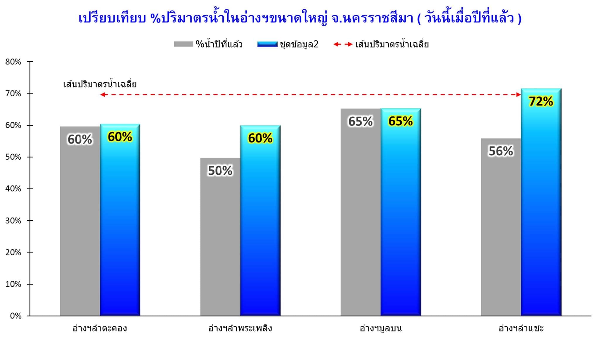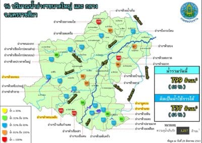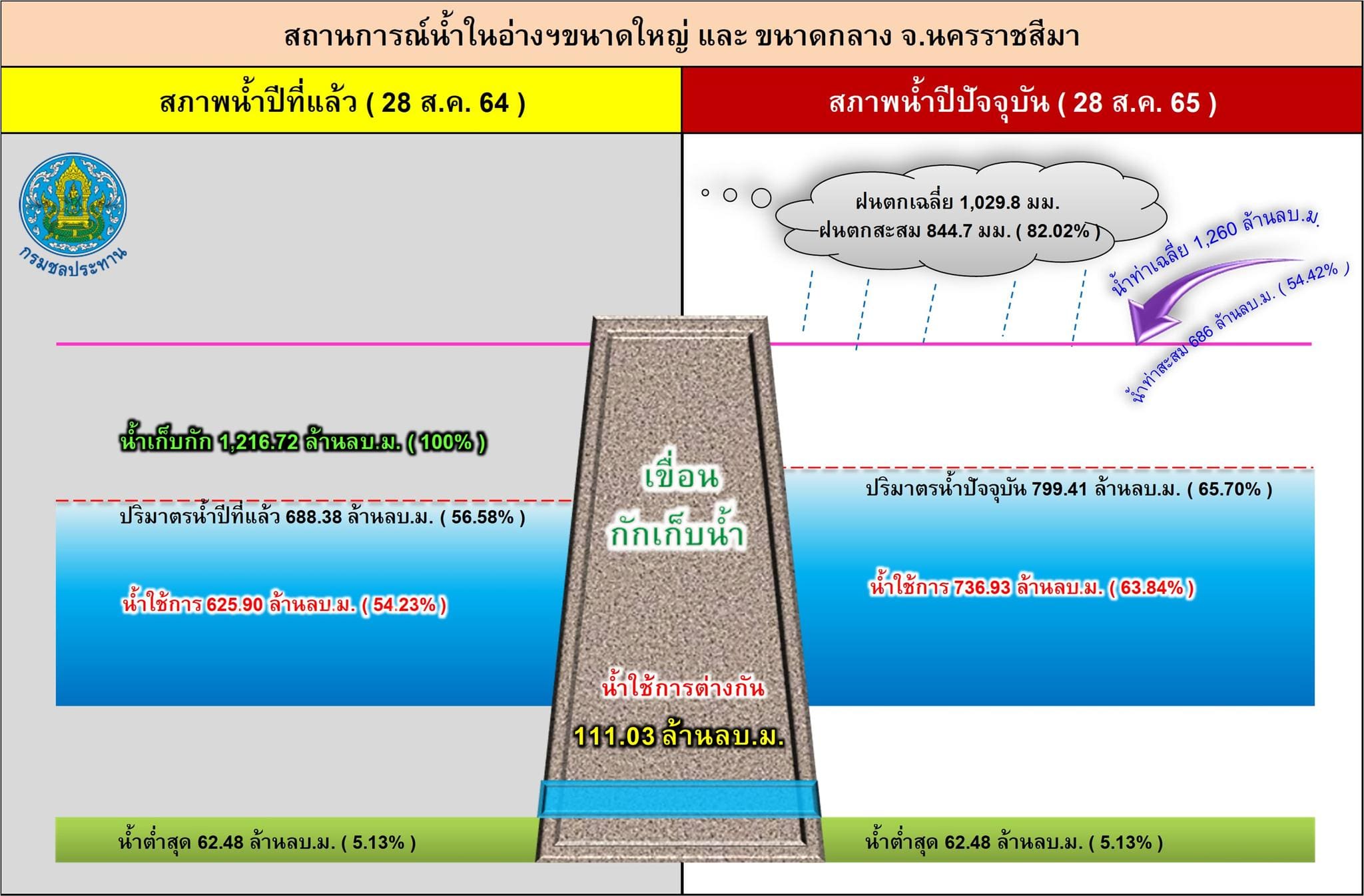 ขณะเดียวกันปริมาณน้ำในอ่างเก็บน้ำขนาดใหญ่ 4 แห่ง ในพื้นที่ จ.นครราชสีมา ได้แก่ อ่างเก็บน้ำลำตะทอง อ.สีคิ้ว, อ่างเก็บน้ำทำพระเพลิง อ.ปักธงชัย, อ่างเก็บน้ำลำแชะ อ.ครบุรี และอ่างเก็บน้ำมูลบน อ.ครบุรี มีปริมาณน้ำกักเก็บรวมกัน 571.558 ล้านลูกบาศก์เมตร คิดเป็นร้อยละ 64.55 ของความจุกักเก็บทั้งหมด 885.49 ล้านลูกบาศก์เมตรเท่านั้น จึงไม่น่าเป็นห่วงอะไร ยังสามารถรับน้ำได้อีกในปริมาณมาก.