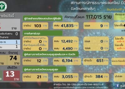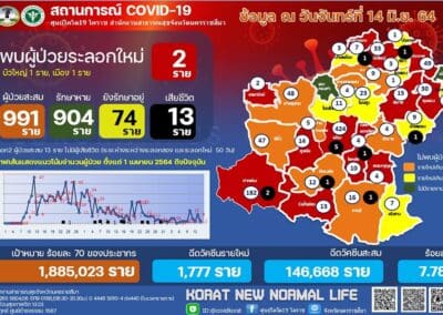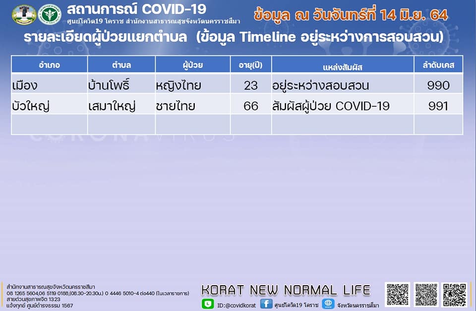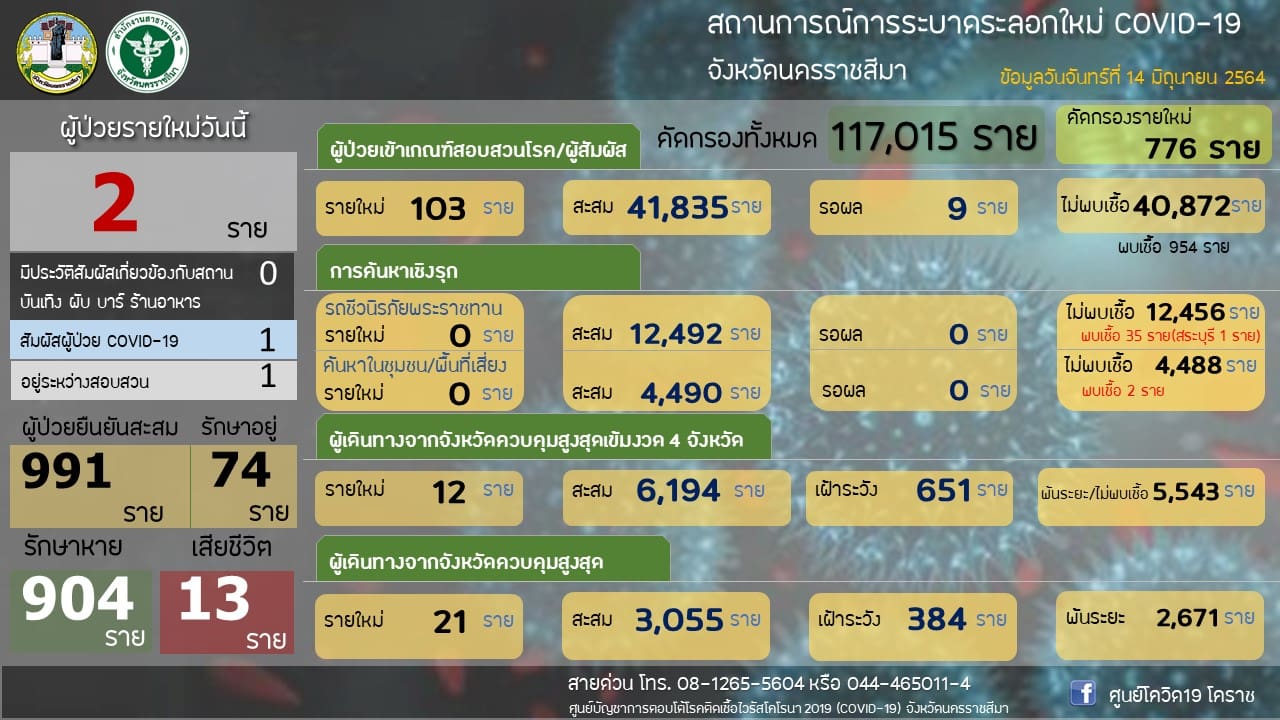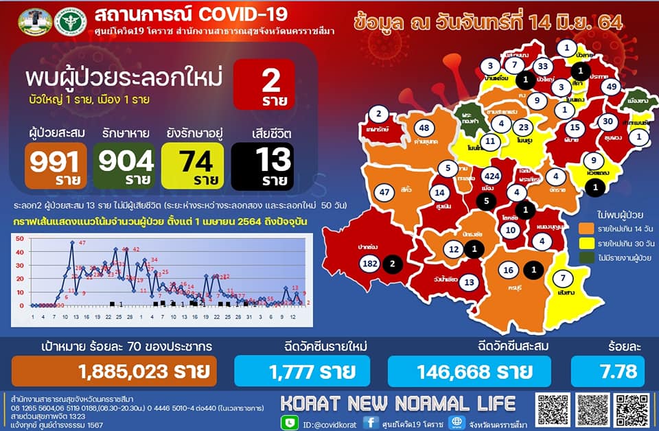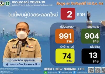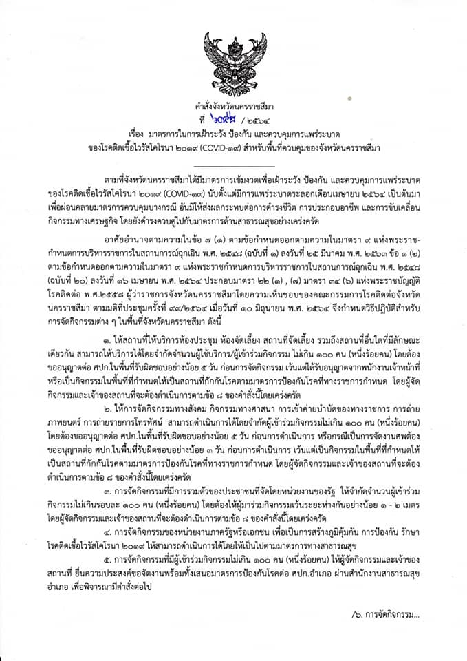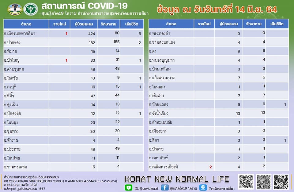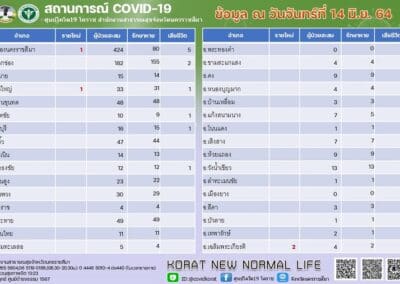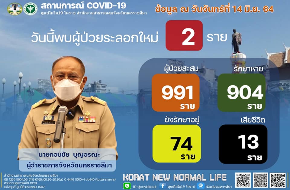 นครราชสีมา – วันนี้ (14 มิถุนายน 2564) ผู้สื่อข่าวรายงานว่า คณะกรรมการควบคุมโรคติดต่อจังหวัดนครราชสีมา ได้เปิดเผยข้อมูลการระบาดของไวรัสโควิด-19 ระลอกใหม่ ในพื้นที่ จ.นครราชสีมา ล่าสุดวันนี้ พบผู้ติดเชื้อรายใหม่เพิ่มขึ้น 2 ราย โดยพบในพื้นที่ ต.บ้านโพธิ์ อ.เมือง 1 ราย ซึ่งเป็นเพศหญิง อายุ 23 ปี และที่ ต.เสมาใหญ่ อ.บัวใหญ่ เป็นเพศชาย อายุ 66 ปี ขณะที่ผู้ป่วยสะสมในระลอกใหม่นี้ มีจำนวน 991 ราย รักษาหายแล้ว จำนวน 904 ราย ยังรักษาอยู่ จำนวน 74 ราย และเสียชีวิต จำนวน 13 ราย ทั้งนี้เมื่อวันที่ 13 มิ.ย. 64 ที่ผ่านมานายกอบชัย บุญอรณะ ผู้ว่าราชการจังหวัดนครราชสีมา ในฐานะประธานคณะกรรมการโรคติดต่อจังหวัดนครราชสีมา ได้ลงนามในคำสั่งจังหวัดนครราชสีมา ที่ 6042/2564 เรื่องมาตรการในการเฝ้าระวัง ป้องกัน และควบคุมการแพร่ระบาดของโรคติดเชื้อไวรัสโคโรนา 2019 (โควิด-19) โดยมีประกาศผ่อนคลายการจัดกิจกรรมต่างๆ ในพื้นที่ จากเดิมห้ามจัดกิจกรรมที่มีการรวมตัวของประชาชนเกินกว่า 50 คน ประกาศผ่อนคลายให้สามารถจัดกิจกรรมที่มีการรวมตัวของประชาชนได้ไม่เกิน 100 คน แต่ผู้จัดกิจกรรมต้องแจ้งให้ ศปก.ในพื้นที่รับผิดชอบล่วงหน้าอย่างน้อย 5 วัน และจะต้องปฏิบัติตามมาตรการป้องกันไวรัสโควิด-19 อย่างเข้มงวด เช่น มีจุดบิการตรวจวัดอุณหภูมิร่างกาย, สวมหน้ากากอนามัย, เว้นระยะห่างระหว่างบุคคลอย่างน้อย 1 เมตร, จัดให้มีที่ล้างมือด้วยเจลแอลกอฮอลล์ฆ่าเชื้อ, จัดอาหารแบบแยกชุดสำหรับรับประทานคนเดียว, งดการให้บริการสุราหรือเครื่องดื่มแอลกอฮอลล์ทุกชนิด, จัดให้มีจุดลงทะเบียนก่อนเข้างาน และออกงาน เป็นต้น