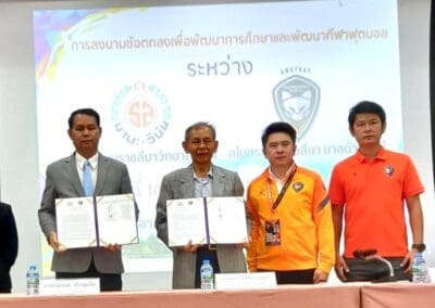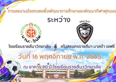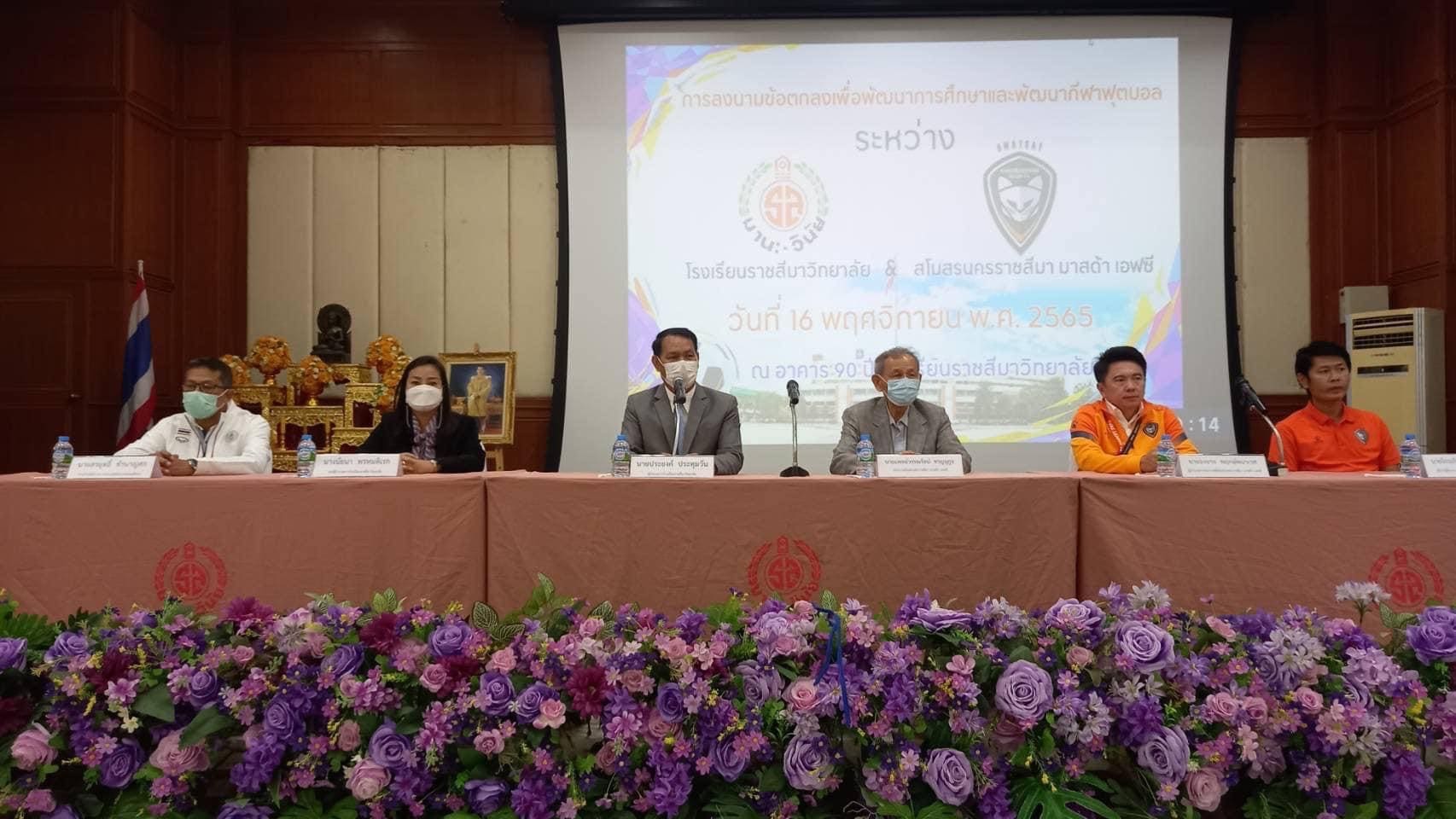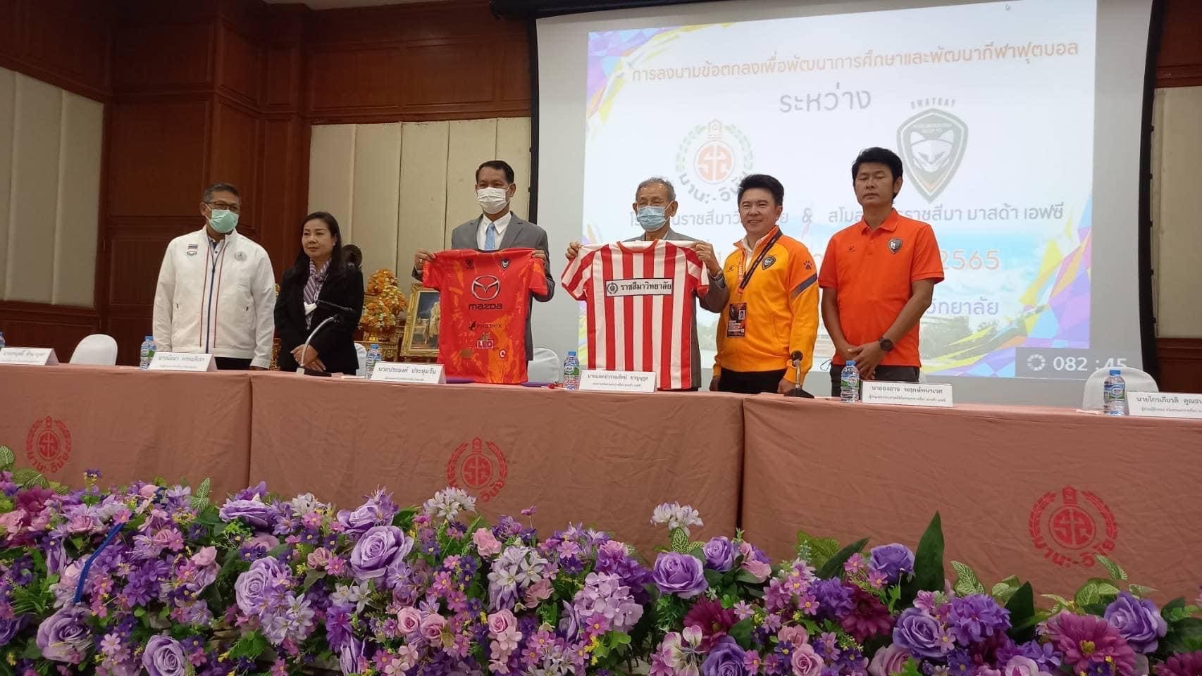 นายแพทย์วรรณรัตน์ ชาญนุกูล ประธานสโมสรนครราชสีมา มาสด้า เอฟซี กับนายประยงค์ ประทุมวัน ผอ.โรงเรียนราชสีมาวิทยาลัย ร่วมลงนาม เพื่อพัฒนาการศึกษาและพัฒนากีฬาฟุตบอล MOU ระหว่างสโมสรนครราชสีมา มาสด้า เอฟซีกับโรงเรียนราชสีมาวิทยาลัย เพื่อเด็กๆ นักฟุตบอลสวาทแคททุกคนได้เรียนที่โรงเรียนประจำจังหวัด ให้ได้เล่นฟุตบอลเพื่อสโมสรฯและโรงเรียนต้นสังกัด พัฒนาไปพร้อมๆกันกับรุ่น14-16-18 ปี ร่วมกันส่งกำลังใจให้น้องๆ สู่นักเตะอาชีพในสิ่งรักและมุ่งมั่นในอนาคต โดยมีคณะครูอาจารย์ โค้ชทุกรุ่น โค้ชท๊อป ไกรเกียรติ น้องตูน MC ที่จะได้ร่วมกันส่งเสริมโครงการดีๆ สำหรับนักฟุตบอลเพื่อจังหวัดนครราชสีมา