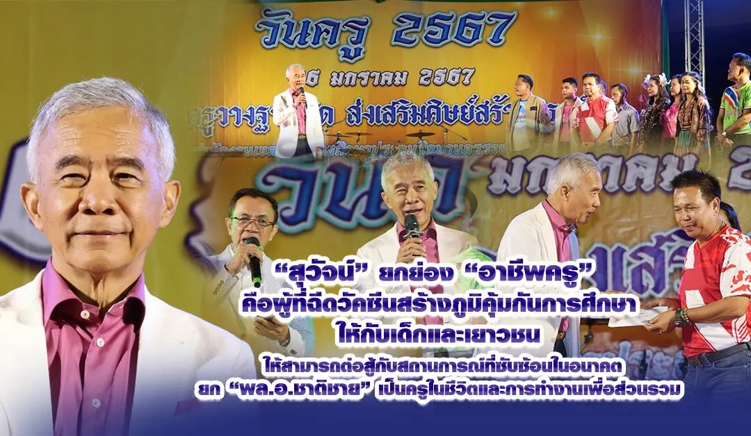 “สุวัจน์” ยกย่อง “อาชีพครู” คือผู้ที่ฉีดวัคซีนสร้างภูมิคุ้มกันการศึกษาให้กับเด็กและเยาวชน ให้สามารถต่อสู้กับสถานการณ์ที่ซับซ้อนในอนาคต ยก “พล.อ.ชาติชาย” เป็นครูในชีวิตและการทำงานเพื่อส่วนรวม