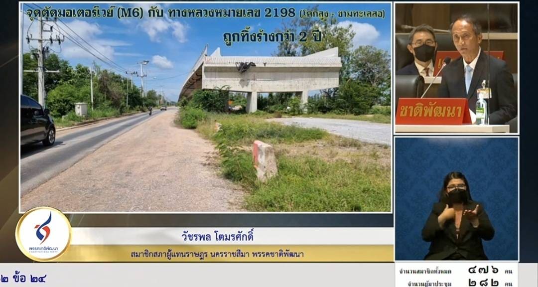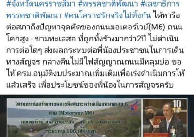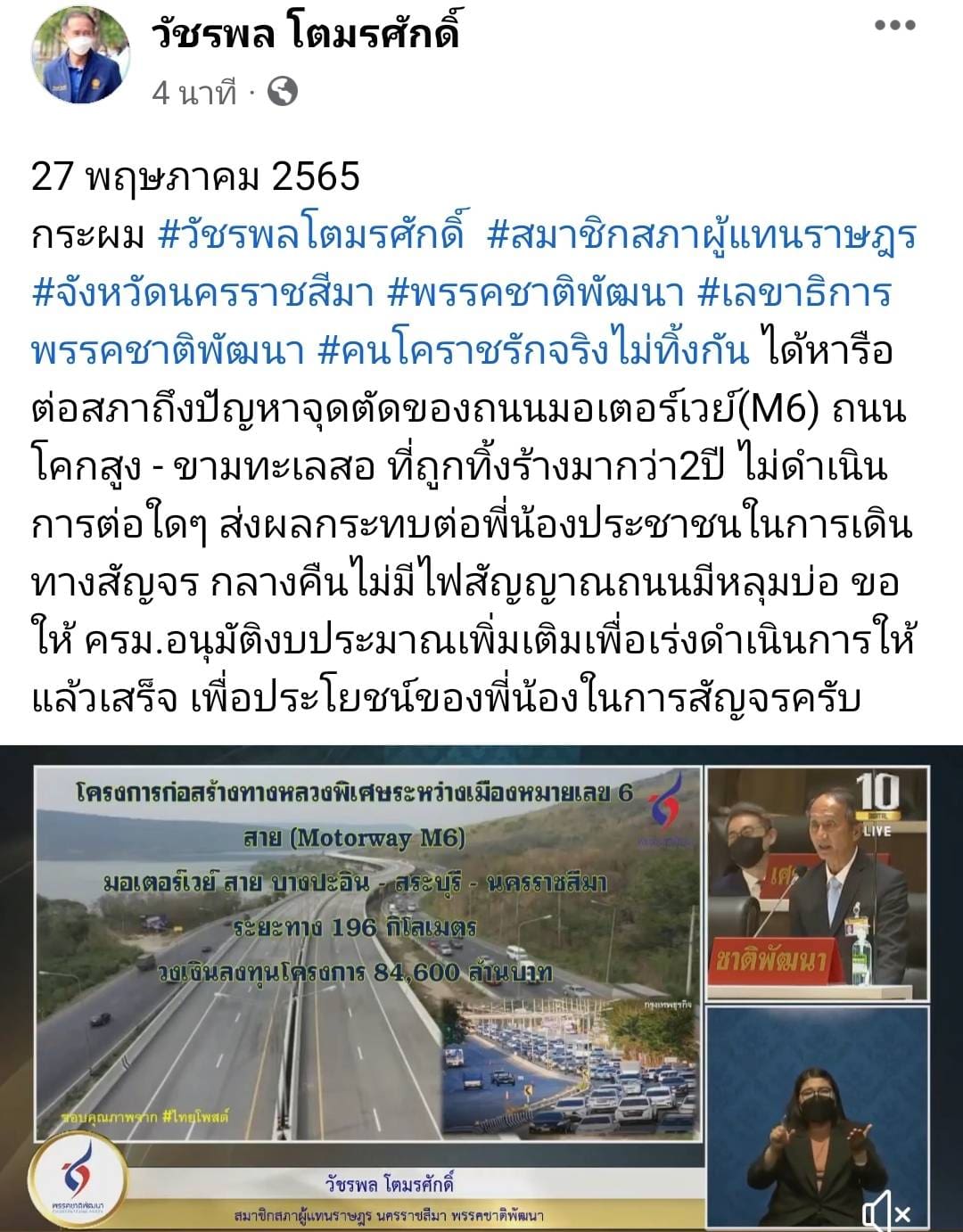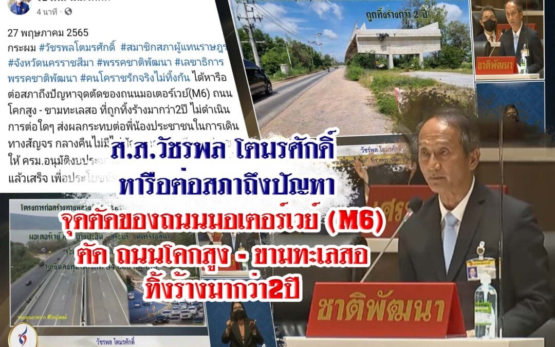 นาย วัชรพล โตมรศักดิ์ สมาชิกสภาผู้แทนราษฎร จังหวัดนครราชสีมา พรรคชาติพัฒนา เลขาธิการพรรคชาติพัฒนา ได้หารือต่อสภาถึงปัญหาจุดตัดของถนนมอเตอร์เวย์(M6) ตัด ถนนโคกสูง – ขามทะเลสอ ที่ถูกทิ้งร้างมากว่า2ปี ไม่ดำเนินการต่อใดๆ ส่งผลกระทบต่อพี่น้องประชาชนในการเดินทางสัญจร กลางคืนไม่มีไฟสัญญาณถนนมีหลุมบ่อ