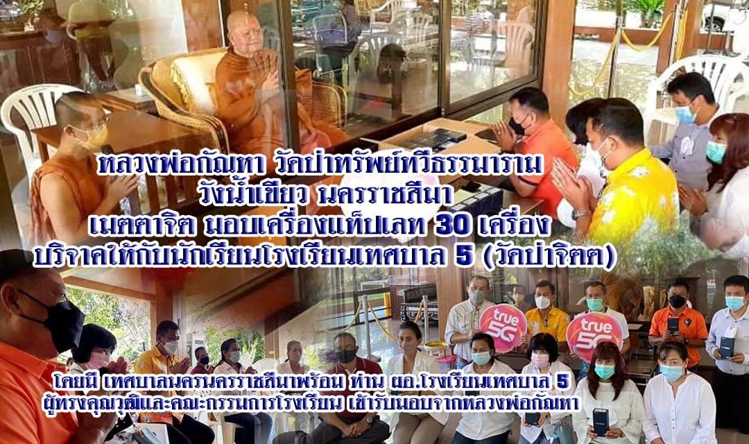 สมาชิกสภาเทศบาลนครนครราชสีมาพร้อมท่านผอ.โรงเรียนเทศบาล 5 วัดป่าจิตต ผู้ทรงคุณวุฒิและคณะกรรมการโรงเรียน เดินทางไปรับมอบเครื่องแท็ปเลท 30 เครื่อง จากหลวงพ่อกัณหา สุขกาโม วัดป่าทรัพย์ทวีธรรมมาราม มีเมตตาจิต บริจาคให้กับนักเรียนโรงเรียนเทศบาล 5 วัดป่าจิตต เพื่อมอบให้เด็กนักเรียนขาดแคลนเรียน online เป็นที่เรียบร้อย ขออนุโมทนา สาธุ กับบุญบารมีของหลวงพ่อกัณหา