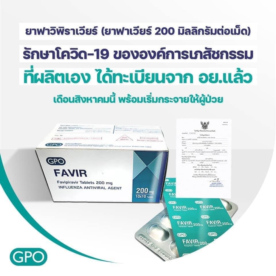 ยาฟาวิพิราเวียร์ ภายใต้ชื่อ ฟาเวียร์ (200 มิลลิกรัมต่อเม็ด) ขององค์การเภสัชกรรม ที่วิจัย พัฒนาและผลิตเอง ได้รับการขึ้นทะเบียนจากสำนักงานคณะกรรมการอาหารและยา (อย.) แล้ว ต้นสิงหาคมนี้เริ่มกระจายเข้าระบบการรักษาผู้ป่วยโควิด-19 โดยระยะแรกผลิตได้ไม่น้อยกว่าเดือนละ 2 ล้านเม็ด และจะขยายกำลังการผลิตเพิ่มมากขึ้นอย่างต่อเนื่อง การผลิตยาดังกล่าวขององค์การฯครั้งนี้ ทำให้ราคายาถูกลงกว่าการนำเข้ายาจากต่างประเทศ ส่งผลให้รัฐประหยัดค่าใช้จ่ายด้านยาของประเทศ