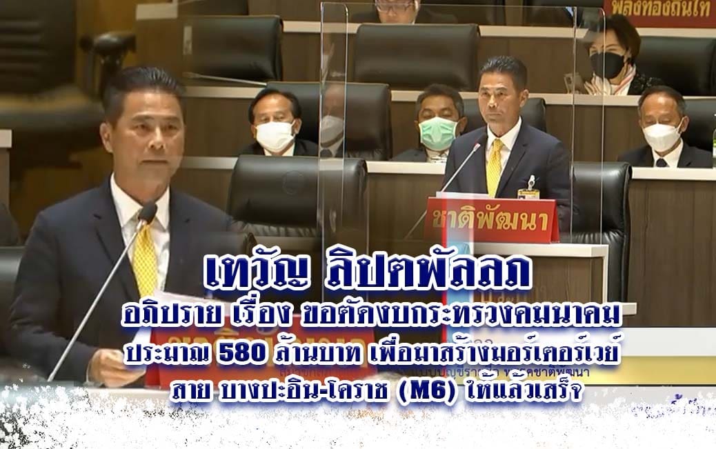 นายเทวัญ ลิปตพัลลภ อภิปราย เรื่อง ขอตัดงบกระทรวงคมนาคม ประมาณ 580 ล้านบาท เพื่อมาสร้าง มอร์เตอร์เวย์ สาย บางปะอิน-โคราช (M6) ให้แล้วเสร็จ ซึ่งขาดงบไปประมาณ 6,000 ล้านบาท เนื่องจากหากเปิดใช้บริการเส้นทางนี้ได้ จะสามารถกระตุ้นเศรษฐกิจ ประหยัดน้ำมัน ประหยัดเวลาในการเดินทาง ช่วยลดอุบัติเหตุในช่วงเทศกาลต่างๆได้ด้วย และรัฐสามารถหารายได้จากการเปิดให้บริการเส้นทางนี้ได้ถึงประมาณ 3,650 ล้านต่อปีด้วยครับ