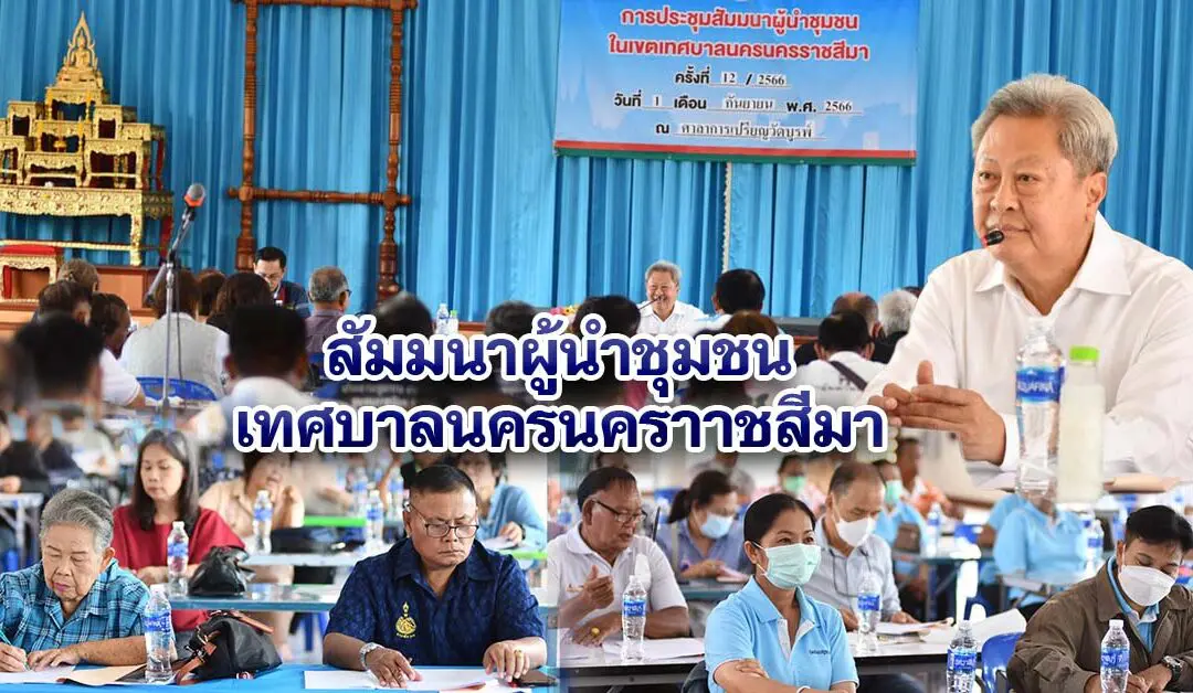 นายประเสริฐ บุญชัยสุข นายกเทศมนตรีนครนครราชสีมา พร้อมด้วยคณะผู้บริหาร สมาชิกสภาเทศบาล รองปลัดเทศบาล ผู้อำนวยการสำนัก/กอง และเจ้าหน้าที่กองสวัสดิการสังคม ร่วมประชุมสัมมนาผู้นำชุมชนในเขตเทศบาลนครนครราชสีมา ครั้งที่ 12/2566 เพื่อรับฟังปัญหาความเดือดร้อนของประชาชนในชุมชนในเขตเทศบาล ณ ศาลาการเปรียญวัดบูรพ์
