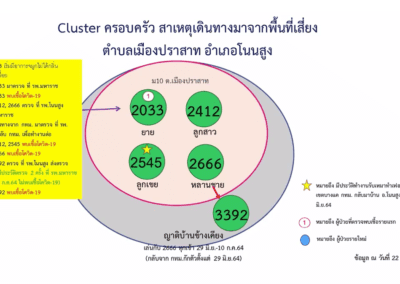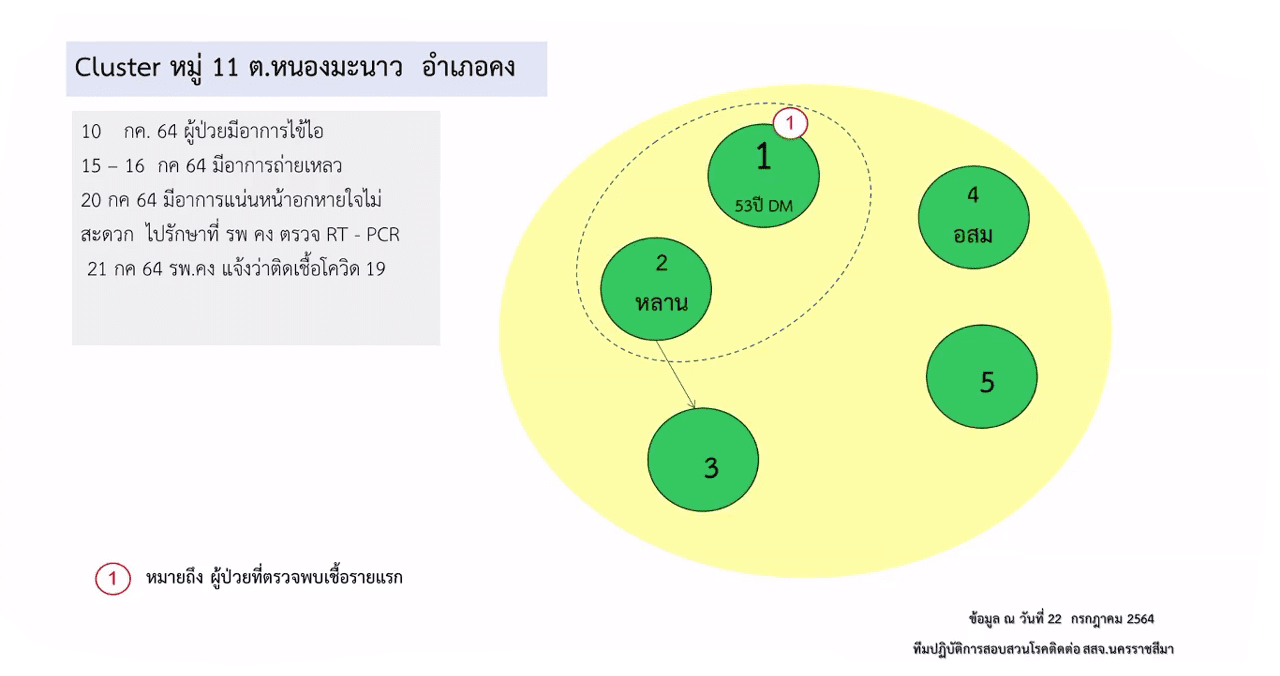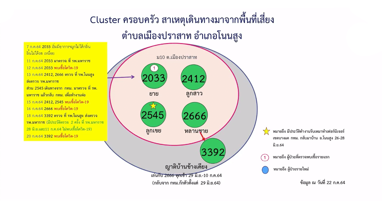 8.คลัสเตอร์ครอบครัว ต.เมืองปราสาท อ.โนนสูง ตรวจพบเชื้อรายแรกเมื่อวันที่ 12 ก.ค.64 ก่อนที่จะพบผู้ติดเชื้อเพิ่มอีกรวม 5 ราย มีกลุ่มเสี่ยงกว่า 100 ราย