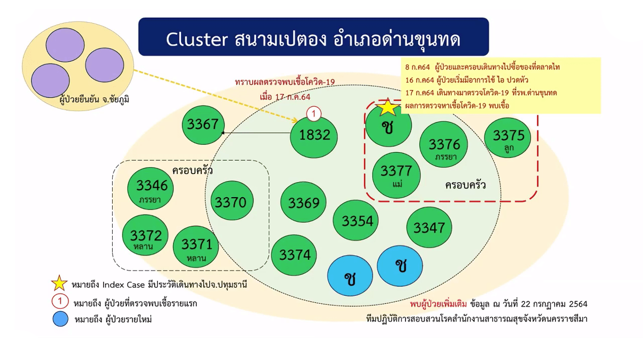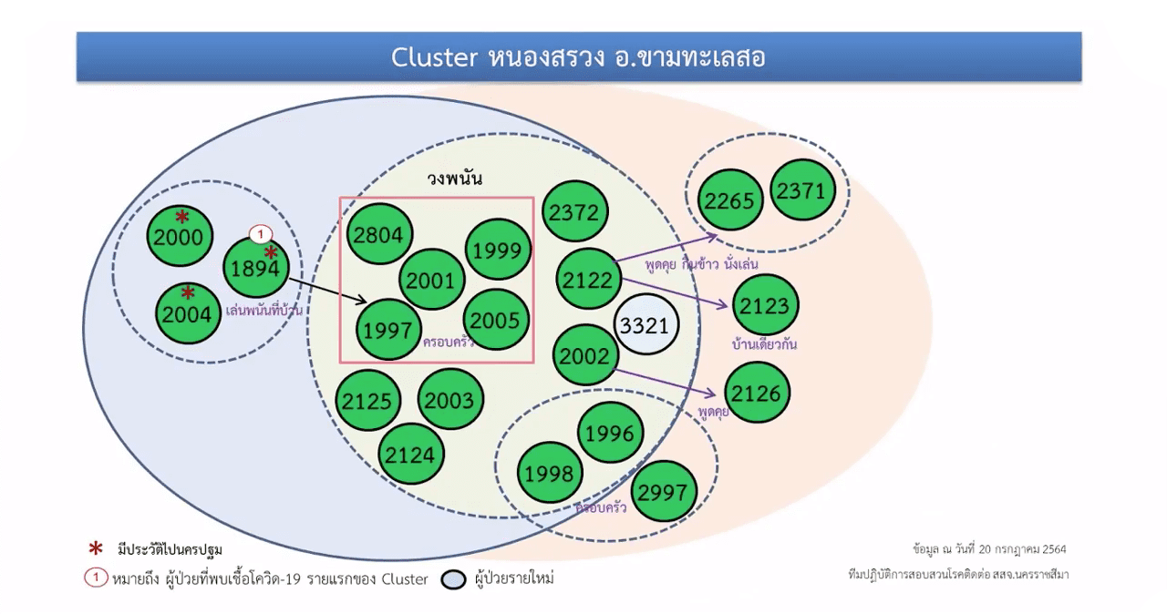 1.คลัสเตอร์สนามเปตอง อ.ด่านขุนทด ซึ่งเกิดจากผู้ป่วยรายที่ 1,832 ของ จ.นครราชสีมา รับเชื้อมาจากพื้นที่ จ.ชัยภูมิ ก่อนที่จะแพร่เชื้อให้กับเพื่อนฝูงที่เล่นเปตองด้วยกัน และกระจายไปสู่ครอบครัวของเพื่อนๆ และคนใกล้ชิด รวม 16 ราย และมีกลุ่มเสี่ยงอีกนับร้อยราย