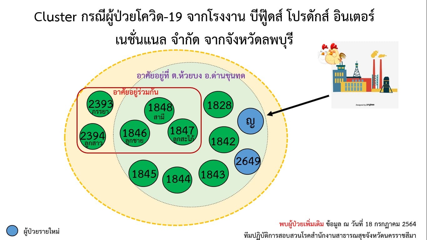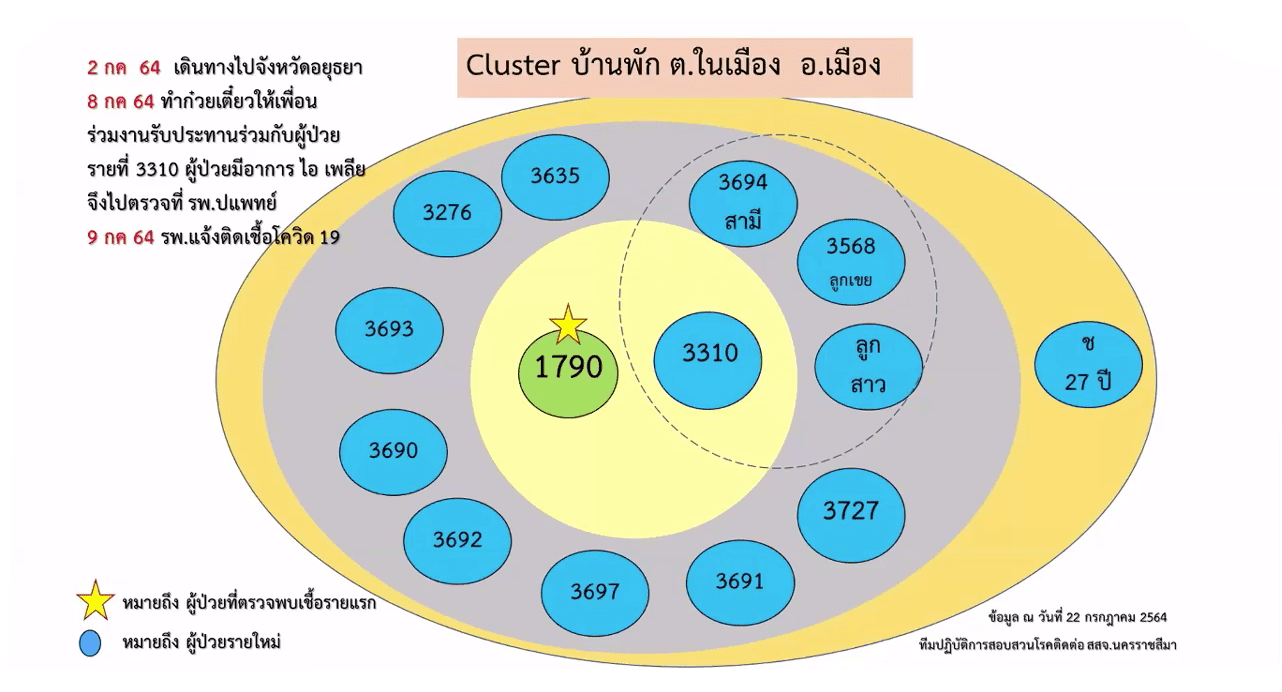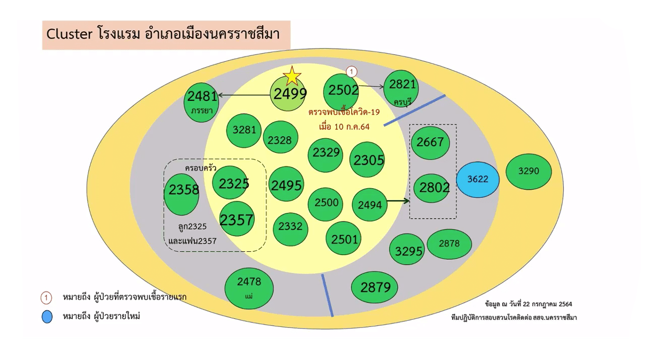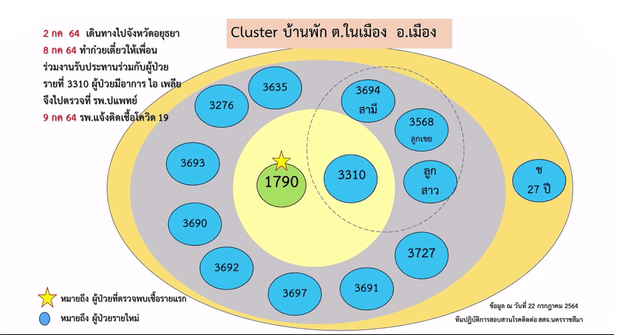 2.คลัสเตอร์บ้านพัก ต.ในเมือง อ.เมืองนครราชสีมา เกิดจากผู้ป่วยรายที่ 1,790 ของ จ.นครราชสีมา ซึ่งเดินทางไป จ.อยุธยา เมื่อวันที่ 2 ก.ค. 64 และติดเชื้อ ก่อนที่จะกลับมาบ้านพัก มีการทำก๋วยเดี๋ยวให้พื้นร่วมงานรับประทาน ทำให้เชื้อระบาดไปติดเพื่อนร่วมงานและครอบครัว รวม 14 ราย มีกลุ่มเสี่ยงนับร้อยราย