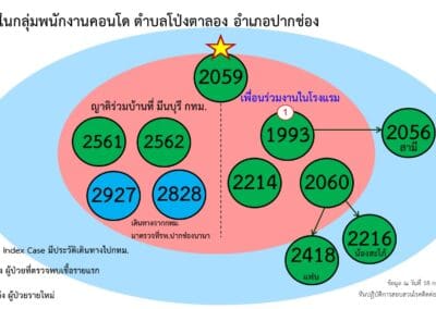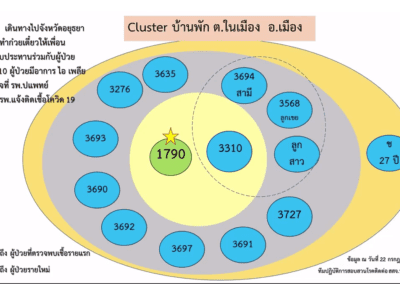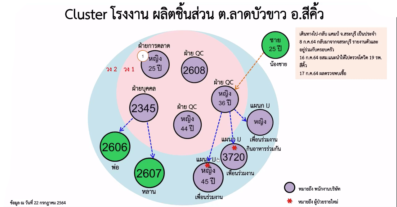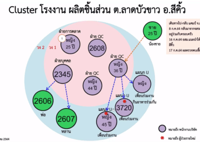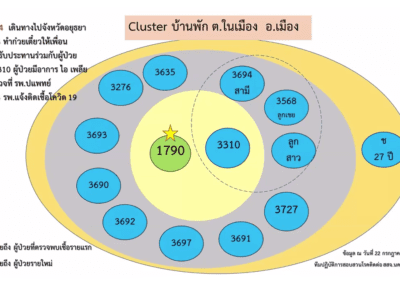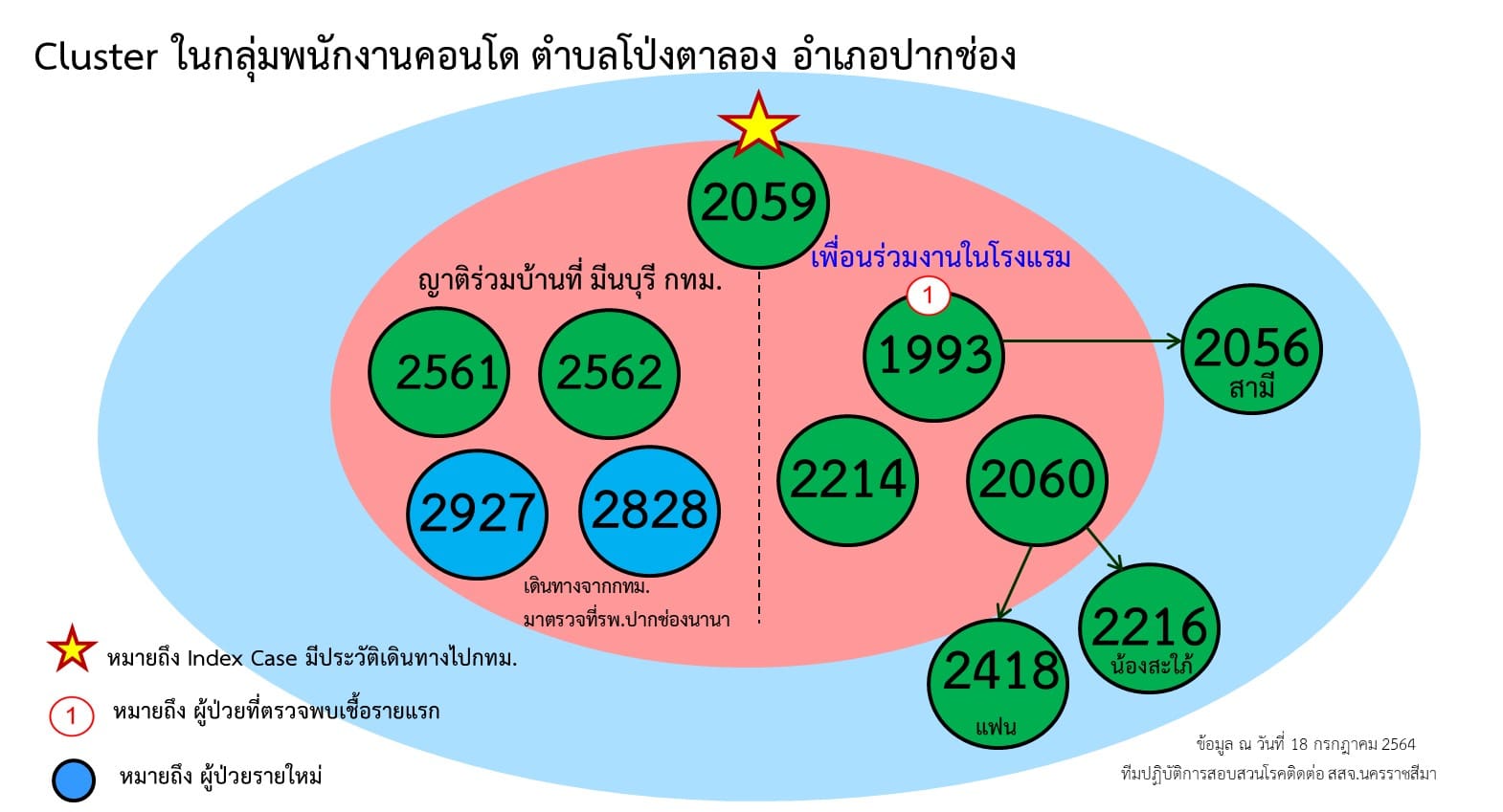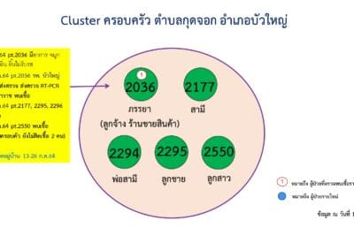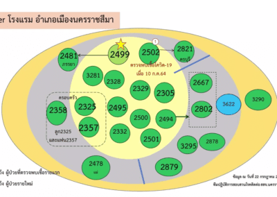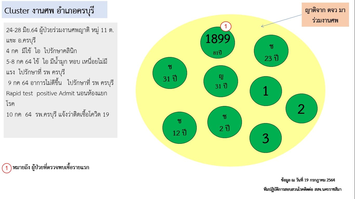 2.คลัสเตอร์บ้านพัก ต.ในเมือง อ.เมืองนครราชสีมา เกิดจากผู้ป่วยรายที่ 1,790 ของ จ.นครราชสีมา ซึ่งเดินทางไป จ.อยุธยา เมื่อวันที่ 2 ก.ค. 64 และติดเชื้อ ก่อนที่จะกลับมาบ้านพัก มีการทำก๋วยเดี๋ยวให้พื้นร่วมงานรับประทาน ทำให้เชื้อระบาดไปติดเพื่อนร่วมงานและครอบครัว รวม 14 ราย มีกลุ่มเสี่ยงนับร้อยราย