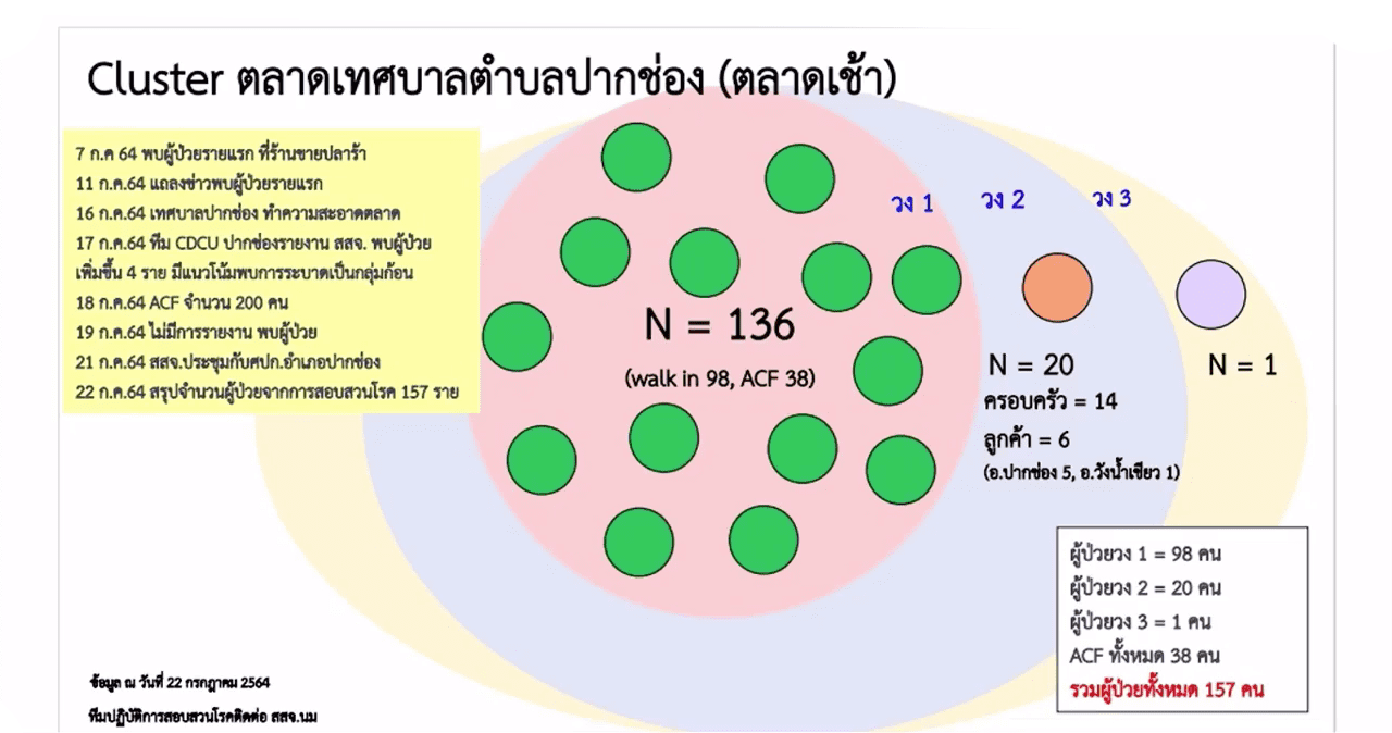 3.คลัสเตอร์ตลาดเช้าเทศบาลตำบลปากช่อง อ.ปากช่อง วันที่ 7 ก.ค.64 ตรวจพบผู้ป่วยรายแรกซึ่งเป็นแม่ค้าขายปลาร้า ก่อนที่จะมีการประกาศปิดตลาดทำความสะอาด และตรวจเชื้อเชิงรุก และพบผู้ติดเชื้อมากถึง 157 ราย และมีกลุ่มเสี่ยงอีกเกือบ 2,000 คน
