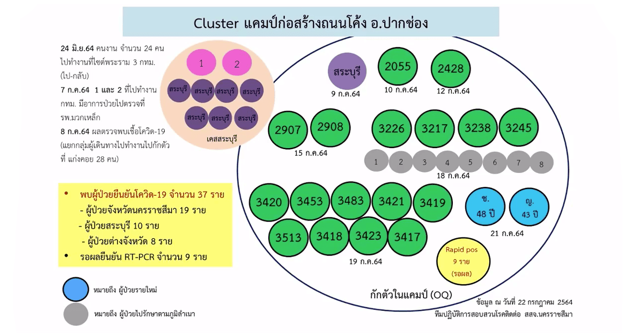 6.คลัสเตอร์แคมป์คนงานก่อสร้างบ้านถนนโค้ง อ.ปากช่อง โดยมีประวัติคนงาน 24 คน เดินทางไปทำงานที่ไซต์คนงานพระราม 3 กทม. เมื่อวันที่ 24 มิ.ย. 64 และติดเชื้อทั้งหมด ก่อนที่จะนำมากระจายเชื้อให้กับเพื่อนร่วมงานที่ อ.ปากช่อง รวมผู้ติดเชื้อ 37 ราย และมีกลุ่มเสี่ยงนับร้อยคน