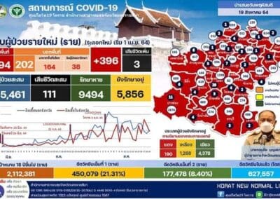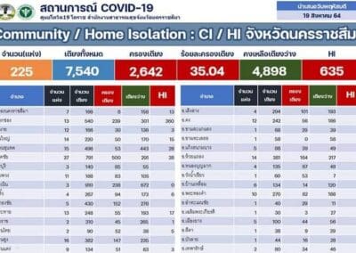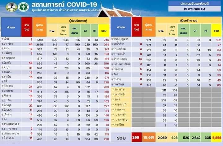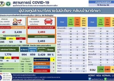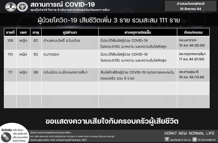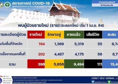 นครราชสีมา – วันนี้ (19 สิงหาคม 2564) ศูนย์โควิด-19 สำนักงานสาธารณสุขจังหวัดนครราชสีมา ได้เปิดเผยตัวเลขผู้ติดเชื้อโควิด-19 ในพื้นที่ จ.นครราชสีมา ล่าสุด วันนี้มีผู้ติดเชื้อเพิ่มขึ้น จำนวน 396 ราย เสียชีวิต 3 ราย โดยในจำนวนผู้ติดเชื้อรายใหม่ เป็นการติดเชื้อในพื้นที่ จำนวน 194 ราย และมาจากนอกพื้นที่ จำนวน 202 ราย ทำให้ขณะนี้มีผู้ติดเชื้อในระลอกใหม่สมสม จำนวน 15,461 ราย รักษาหายแล้ว จำนวน 9,494 ราย ยังรักษาอยู่ จำนวน 5,856 ราย และเสียชีวิต จำนวน 111 ราย สำหรับผู้เสียชีวิต 3 รายล่าสุดวันนี้ รายที่ 109 เป็นเพศหญิง อายุ 62 ปี ชาว ต.ถนนโพธิ์ อ.โนนไทย จ.นครราชสีมา มีประวัติสัมผัสกับผู้ป่วยโควิด-19 และมีโรคประจำตัวคือเบาหวานและความดันสูง เสียชีวิตที่ รพ.มหาราชนครราชสีมา เมื่อวันที่ 15 ส.ค.64, ผู้เสียชีวิตรายที่ 110 เป็นเพศหญิง อายุ 62 ปี ชาว อ.ปากช่อง มีประวัติสัมผัสผู้ป่วยโควิด-19 และมีโรคประจำตัวคือเบาหวาน และความดันโลหิตสูง เสียชีวิตที่ รพ.กรุงเทพราชสีมา เมื่อวันที่ 17 ส.ค.64 และผู้เสียชีวิตรายที่ 111 เป็นเพศหญิง อายุ 88 ปี ชาว ต.ในเมือง อ.เมืองนครราชสีมา มีประวัติสัมผัสใกล้ชิดผู้ป่วยโควิด-19 ซึ่งมีบุตรชายและคนในครอบครัวติดเชื้อรวม 5 ราย เสียชีวิตที่โรงพยาบาลค่ายสุรนารี เมื่อวันที่ 18 ส.ค.64