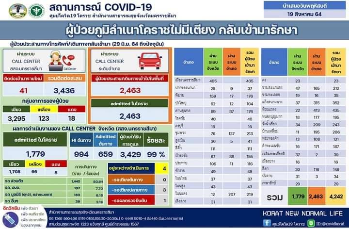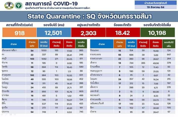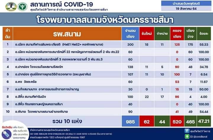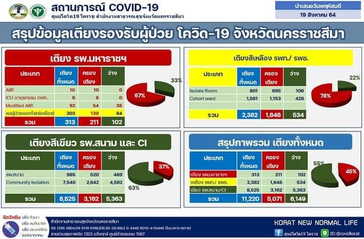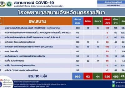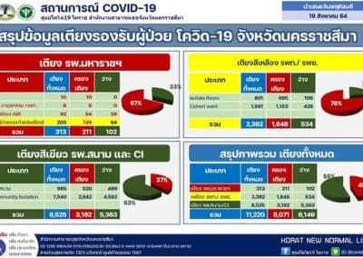 ขณะเดียวกันโรงพยาบาลสนามในพื้นที่ จ.นครราชสีมา ทั้ง 32 อำเภอ ซึ่งมีเตียงรองรับผู้ป่วยโควิด-19 ได้จำนวน 11,220 เตียง ขณะนี้รับผู้ป่วยเข้ารักษาแล้ว จำนวน 5,071 เตียง ยังมีเตียงว่างสามารถรองรับผู้ป่วยได้อีก จำนวน 6,149 เตียง ส่วนการรับตัวผู้ป่วยติดเชื้อโควิด-19 ชาว จ.นครราชสีมา จากนอกพื้นที่ เข้ามารักษา ตั้งแต่ช่วงปลายเดือนมิถุนายน 2564 จนถึงขณะนี้รับตัวผู้ป่วยมารักษาแล้ว จำนวน 2,463 ราย.