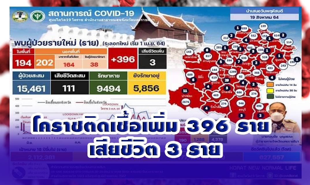 โคราชติดเชื้อเพิ่ม 396 ราย เสียชีวิต 3 ราย ขณะที่โรงพยาบาลสนามยังสามารถรับผู้ป่วยได้อีกกว่า 6 พันเตียง