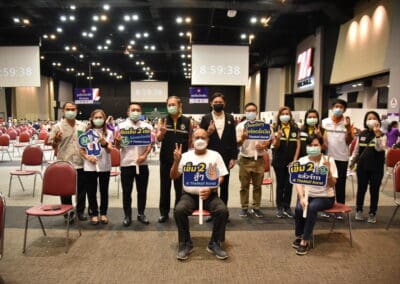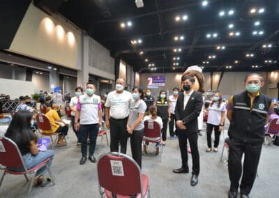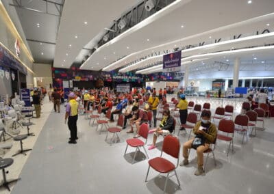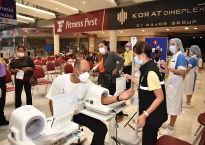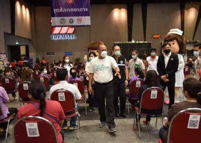นครราชสีมา – วันนี้ (12 มิถุนายน 2564) ที่ห้องเอ็มซีซีฮอลล์ ชั้น 3 เดอะมอลล์นครราชสีมา บรรยากาศการฉีดวัคซีนป้องกันไวรัสโควิด-19 ซึ่งรับผิดชอบโดยโรงพยาบาลเทพรัตน์นครราชสีมา ได้มีประชาชนเดินทางมาเข้าคิวฉีดกันอย่างคึกคัก โดยวันนี้เป็นการฉีดวัคซีนยี่ห้อซิโนแวคเข็มที่ 1-2 ให้กับประชาชนที่จองคิวผ่านระบบหมอพร้อม และโคราชพร้อม ขณะเดียวกันนายกอบชัย บุญอรณะ ผู้ว่าราชการจังหวัดนครราชสีมา ก็ได้เดินทางมาฉีดวัคซีนป้องกันไวรัสโควิด-19 เป็นเข็มที่ 2 ในวันนี้ด้วย ทั้งนี้ภายหลังจากที่การระบาดของไวรัสโควิด-19 ในพื้นที่ จ.นครราชสีมา เริ่มดีขึ้นมาอย่างต่อเนื่องหลายสัปดาห์ แต่ล่าสุด เมื่อวานนี้ (11 มิ.ย.64) พบว่ามีคลัสเตอร์ใหม่เกิดขึ้นในพื้นที่ อ.เมืองนครราชสีมา โดยเป็นคลัสเตอร์ครอบครัวแม่ค้าขายของเล่น อยู่ในโรงพยาบาลเซนต์แมรี่ ซึ่งมีญาติและครอบครัวที่ติดเชื้อจากคลัสเตอร์นี้ 8 คน หนึ่งในนั้นยังประกอบอาชีพนวดแผนไทยอยู่ในโรงพยาบาลเซนต์เมรี่ด้วย ซึ่งมีกลุ่มสัมผัสเสี่ยงสูงจำนวนมาก เพราะต้องให้บริการลูกค้าหลายราย นอกจากนี้ยังมีเด็กนักเรียนชั้น ป.3 ที่ติดเชื้อจากคลัสเตอร์นี้แล้วได้ไปเรียนในโรงเรียนกวดวิชาแห่งหนึ่งในตัวเมืองโคราชด้วย ทำให้ขณะนี้ทาง ศบค.จังหวัดนครราชสีมา ต้องเร่งฉีดวัคซีนให้กับประชาชนในพื้นที่ อ.เมืองนครราชสีมาอย่างต่อเนื่อง เพื่อเร่งสกัดคลัสเตอร์ใหม่นี้ ที่อาจจะแพร่กระจายเชื้อลุกลามไปยังกลุ่มอื่นๆ อีก.