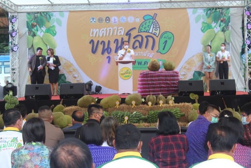 นครราชสีมา – เมื่อเวลา 09.30 น. วันที่ 21 พฤษภาคม 2565 ที่องค์การบริหารส่วนตำบลสระว่านพระยา อ.ครบุรี จ.นครราชสีมา นายวิเชียร จันทรโณทัย ผู้ว่าราชการจังหวัดนครราชสีมา เป็นประธานเปิดเทศกาลขนุนโลก หนุนนำ หมากมั่งมี ครั้งที่ 1 ซึ่งทางองค์การบริหารส่วนตำบลสระว่านพระยาจัดขึ้น เพื่อกระตุ้นราคาขนุนที่กำลังตกต่ำอยู่ในขณะนี้ โดยราคาขนุนแก่ล่าสุดหน้าสวนเหลือเพียง 2 บาทต่อกิโลกรัม จากก่อนหน้านี้ราคาสูงสุดกิโลกรัมละกว่า 40 บาท สร้างความเดือดร้อนให้แก่เกษตรกรเป็นอย่างมาก