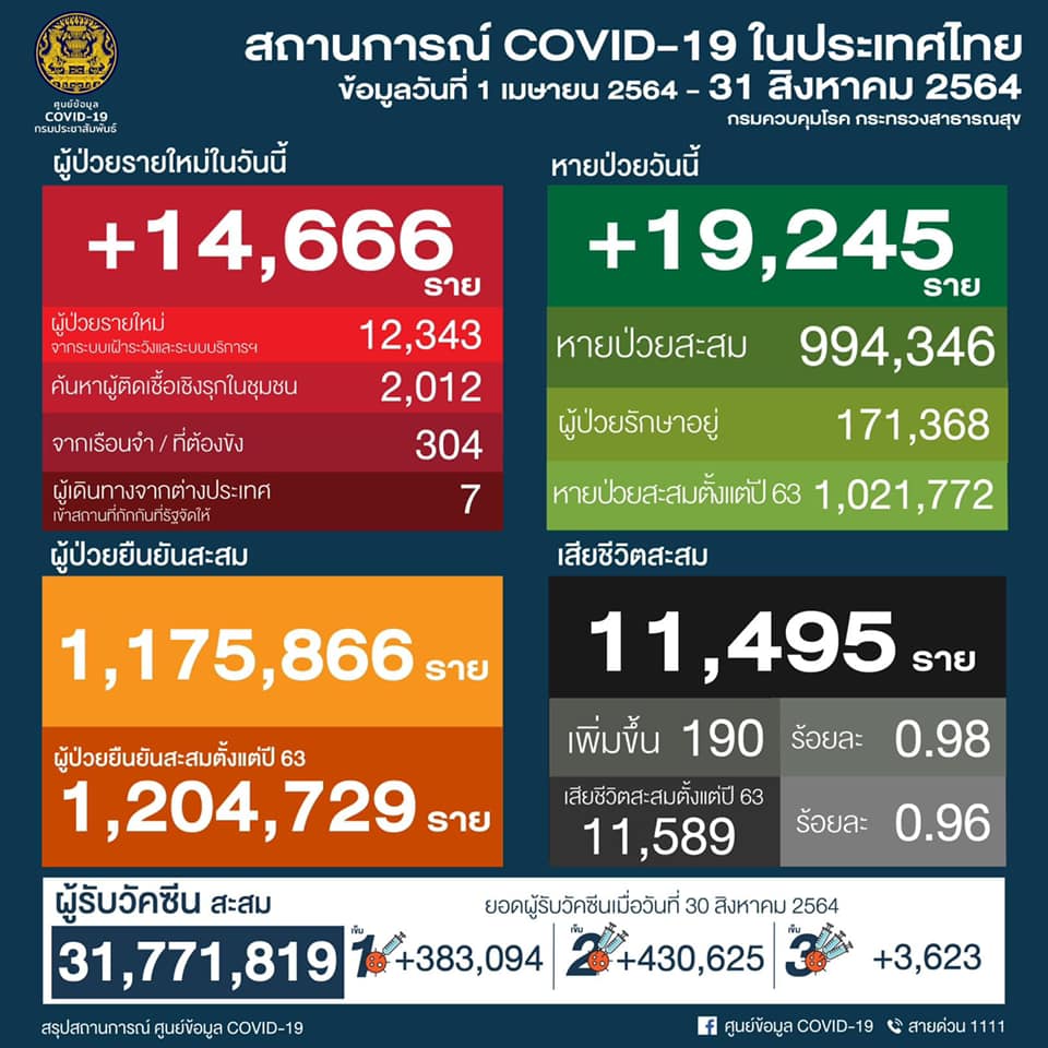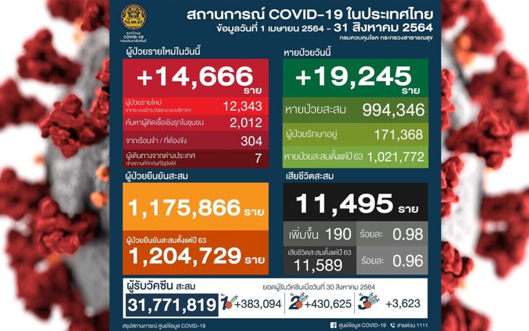 ศูนย์ข้อมูลโควิด 19 รายงานสถานการณ์วันนี้ ติดเชื้อเพิ่ม 14,666 ราย เป็นผู้ติดเชื้อใหม่ 14,362 ราย ติดจากเรือนจำ/ที่ต้องขัง 304 ราย