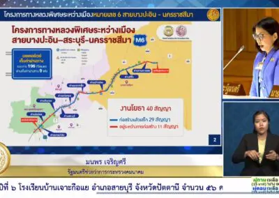 รัฐมนตรีช่วยว่าการกระทรวงคมนาคม ตอบกระทู้ถามสดความคืบหน้าโครงการทางหลวงพิเศษระหว่างเมืองหมายเลข M 6 สายบางปะอิน-นครราชสีมา ระยะทาง 196 กม.ว่าแบ่งเป็นงานโยธาสําหรับก่อสร้าง 40 สัญญา งานระบบที่ด่านเก็บค่าธรรมเนียมผ่านทางทั้งสิ้น 9 ด่าน 1 สัญญา ปัจจุบันมีความก้าวหน้างานโยธาก่อสร้าง จํานวน 29 สัญญาและอยู่ในระหว่างการก่อสร้างทั้งสิ้น 11 สัญญาณ โดยให้ก่อสร้างแล้วเสร็จทุกสัญญาภายในเดือนธันวาคมปี 2568 โดยมีเป้าหมายสามารถที่จะเปิดทดลองให้บริการฟรีตลอดเส้นทางในช่วงเทศกาลปีใหม่ถึง 2569 และพร้อมที่จะเปิดให้บริการเต็มรูปแบบและเริ่มเก็บค่าผ่านทางใน ช่วงต้นปี 2569
