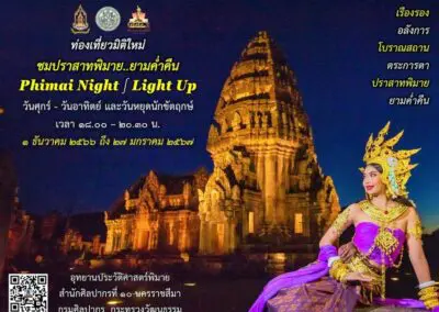 โดยกิจกรรมท่องเที่ยวมิติใหม่ ชมปราสาทหินพิมาย ยามค่ำคืน (Phimai Night – Light Up) จะจัดทุกคืนวันศุกร์- เสาร์-อาทิตย์ วันหยุดนักขัตฤกษ์ และเทศกาลสำคัญตลอดเดือนธันวาคม 2566 ไปถึงเดือนมกราคม 2567 ในช่วงเวลา 18.00 น. – 20.30 น. ซึ่งสายเที่ยวมุมมองใหม่ สายสักการะขอพร สายสะพายกล้องท่องเที่ยวไม่ควรพลาดกิจกรรมดีๆ ที่อุทยานประวัติศาสตร์พิมาย ที่จัดกิจกรรมไว้ต้อนรับนักท่องเที่ยวในช่วงฤดูหนาวนี้ โดยจะเปิดไฟประดับตัวปราสาทด้านใน ตั้งแต่สะพานนาคจนถึงพื้นที่ชั้นในสุดของโบราณสถานในยามค่ำคืนเป็นครั้งแรก เพื่อให้นักท่องเที่ยวได้เข้ากราบไหว้เสริมสิริมงคล สักการะขอพรสิ่งศักดิ์สิทธิ์ประจำศาสนสถาน “พระกัมรเตงชคัตวิมาย” พระพุทธรูปนาคปรก และประติมากรรมรูปเคารพพระเจ้าชัยวรมันที่ 7 มหาราช ในยามค่ำคืน พร้อมดื่มด่ำกับบรรยากาศแสงไฟส่องสาดเรืองรอง อลังการตระการตากับปราสาทหินโบราณที่ใหญ่ที่สุดในประเทศไทย งดงามประดุจสรวงสวรรค์ในยามราตรีไม่มีที่ใดเหมือน ซึ่งนักท่องเที่ยวสามารถสอบถามเพิ่มเติมได้ที่ เบอร์โทร.044 471 1568 สำนักงานอุทยานประวัติศาสตร์พิมาย .
