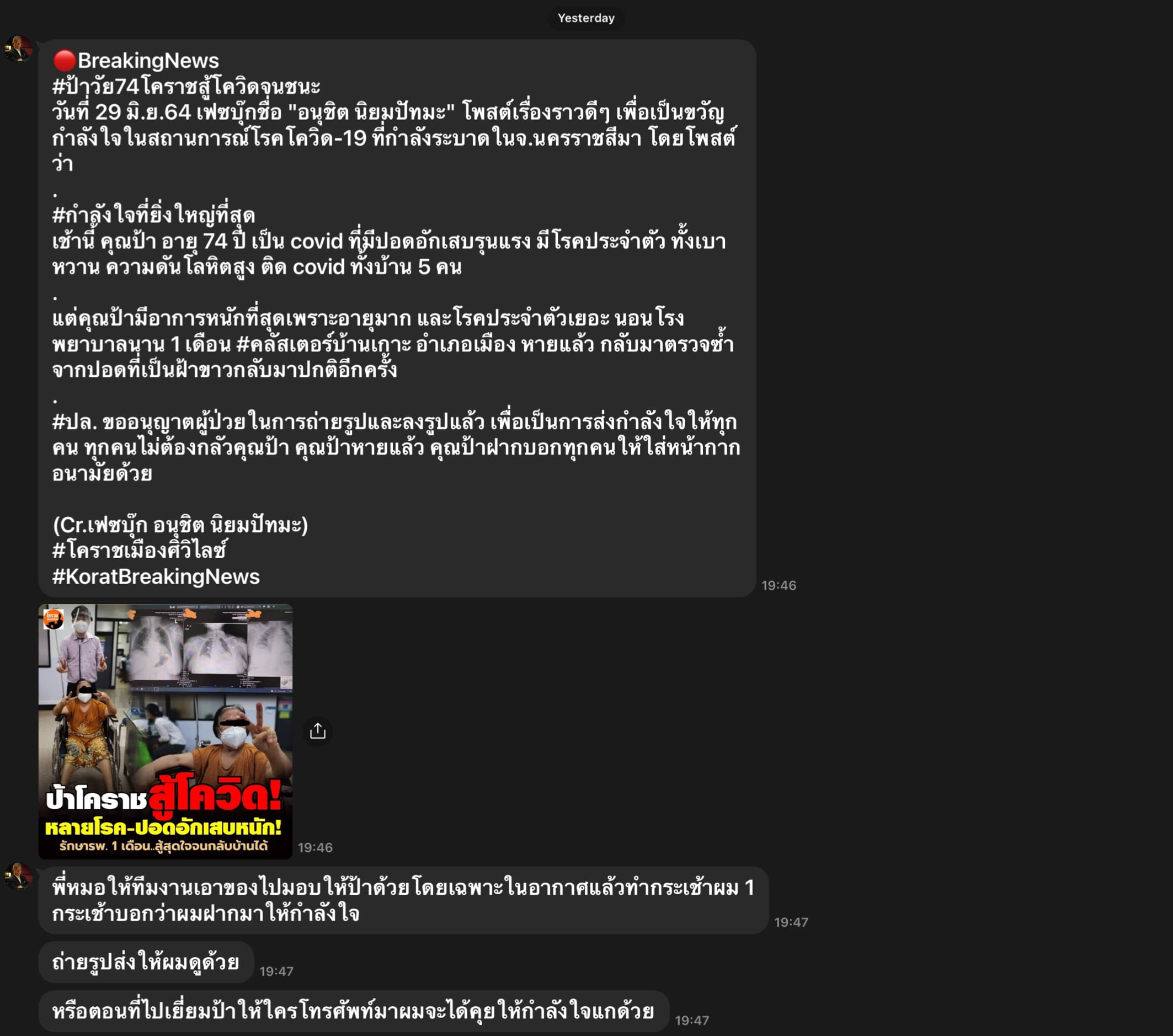 ทั้งนี้ จากข่าวโซเซียล เมื่อวันที่ 29 มิ.ย.64 เฟซบุ๊กชื่อ “อนุชิต นิยมปัทมะ” โพสต์เรื่องราวดีๆ เพื่อเป็นขวัญกำลังใจในสถานการณ์โรคโควิด-19 ที่กำลังระบาดใน จ.นครราชสีมา ซึ่งคุณป้า อายุ 74 ปี เป็นโควิด ที่มีปอดอักเสบรุนแรง มีโรคประจำตัว ทั้งเบาหวาน ความดันโลหิตสูง ติดโควิด ทั้งบ้าน 5 คน