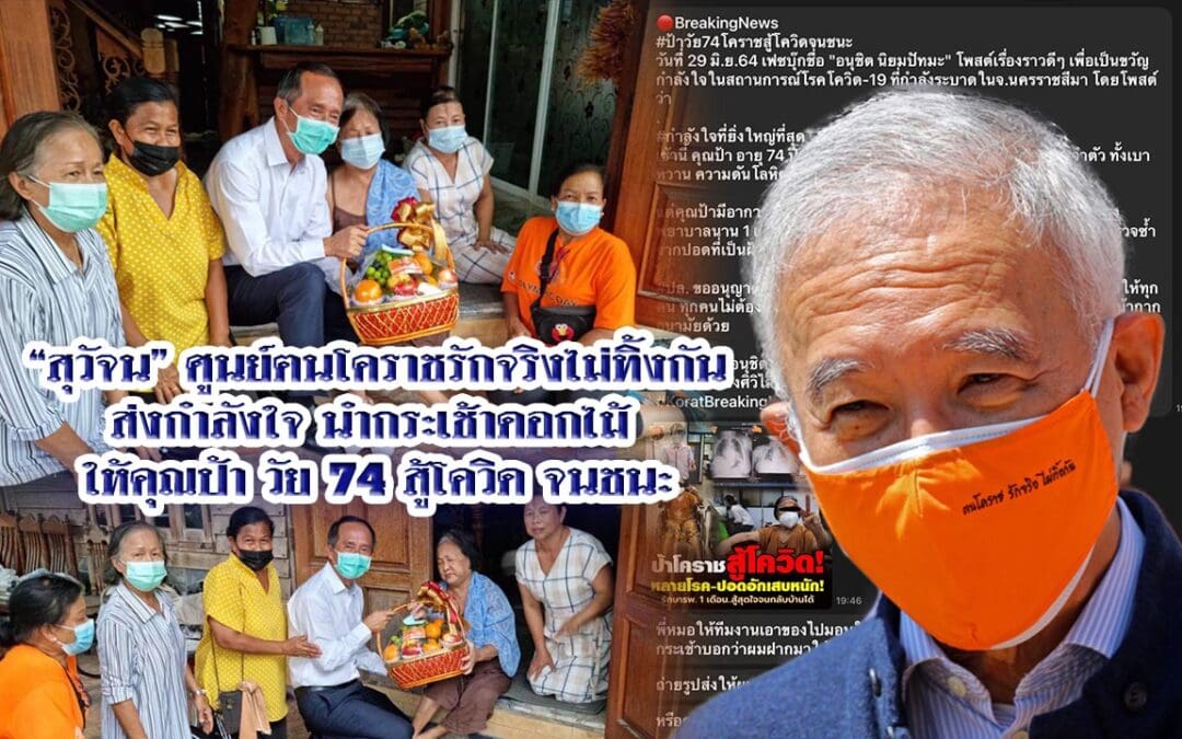 suwat“สุวัจน” ศูนย์ฅนโคราชรักจริงไม่ทิ้งกัน ส่งกำลังใจ นำกระเช้าดอกไม้ ให้คุณป้า วัย 74 สู้โควิดจนชนะ