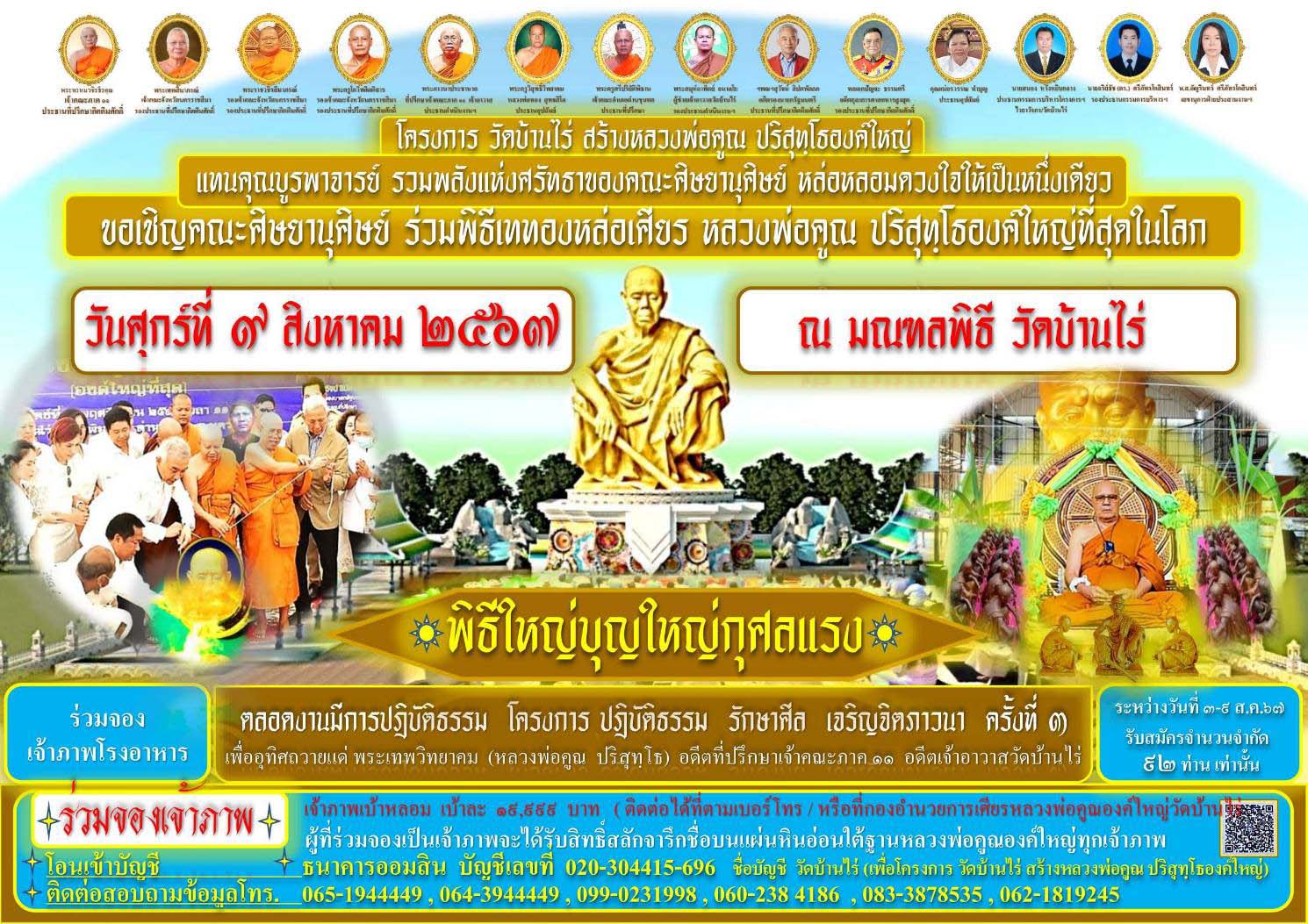 ดังนั้น จึงใคร่ขอเรียนเชิญ คณะศิษยานุศิษย์ ประชาชนทั่วไป คณะศรัทธาที่มีความศรัทธาต่อ หลวงพ่อคูณ ปริสุทโธ ของเรา ได้ร่วมพิธีกันในวันที่ 9 สิงหาคมนี้ แล้วก็ขอเชิญชวนลูกศิษย์ลูกหา พุทธศาสนิกชนและประชาชนทั่วไป ได้ร่วมในการจองเป็นเจ้าภาพเบ้าหลอม เพื่อร่วมเป็นประวัติศาสตร์ วัดบ้านไร่ โดยผู้ที่ร่วมจองเป็นเจ้าภาพจะได้รับการสลักชื่อบนแผ่นศิลาจารึก เอาไว้ที่ใต้ฐานหลวงพ่อคูณองค์ใหญ่ เพื่อเป็นประวัติศาสตร์ร่วมกับวัดบ้านไร่ ตราบนานเท่านาน ชั่วลูกชั่วหลาน