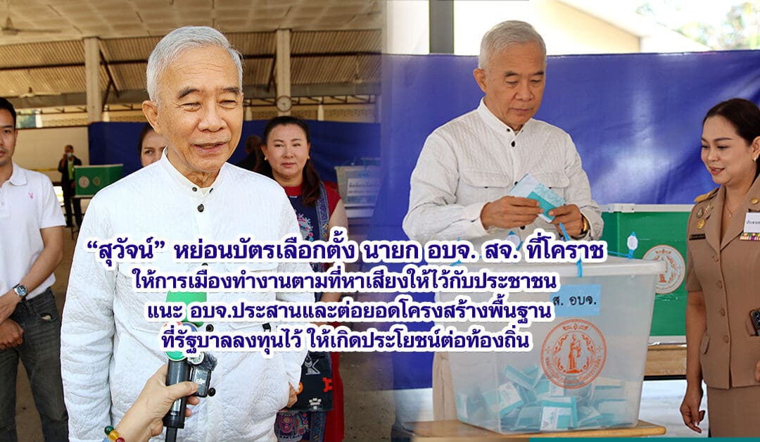 สุวัจน์ หย่อนบัตรเลือกตั้ง นายก อบจ. สจ. ที่โคราช ให้การเมืองทำงานตามที่หาเสียงให้ไว้กับประชาชน แนะ อบจ.ประสานและต่อยอด โครงสร้างพื้นฐาน ที่รัฐบาลลงทุนไว้ ให้เกิดประโยชน์ต่อท้องถิ่น