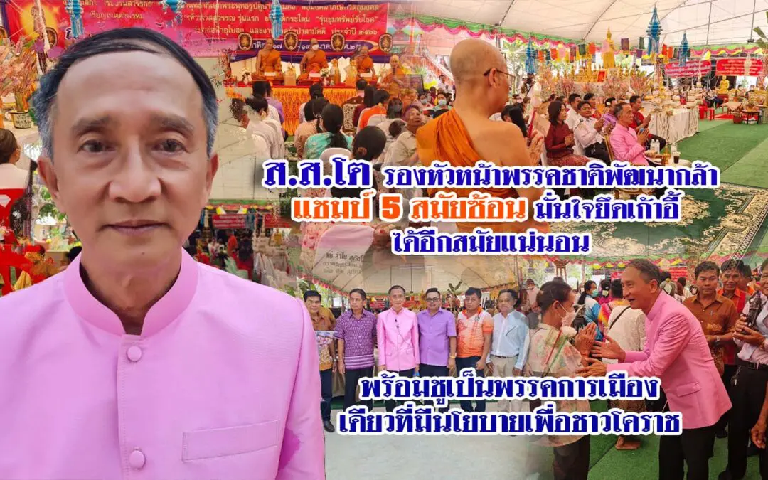สส.โต รองหัวหน้าพรรคชาติพัฒนากล้า แชมป์ 5 สมัยซ้อน ลงพื้นที่หาเสียงในงานยกช่อฟ้าวัดกระโดน มั่นใจยึดเก้าอี้ได้อีกสมัยแน่นอน พร้อมชูเป็นพรรคการเมืองเดียวที่มีนโยบายเพื่อชาวโคราช