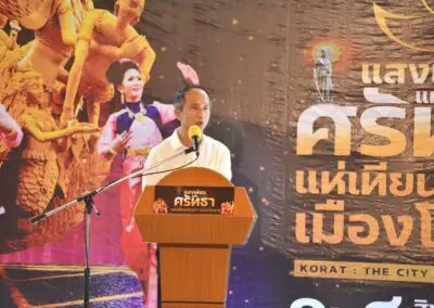 วันที่ 21 กรกฎาคม 2566 เวลา 18.00 น. ที่ศาลาไทยลานอนุสาวรีย์ท้าวสุรนารี ถ.ราชดำเนิน อ.เมือง จ.นครราชสีมา นายภูมิสิทธิ์ วังคีรี รอง ผวจ.นครราชสีมา พร้อมด้วยนายประเสริฐ บุญชัยสุข นายกเทศมนตรีนครนครราชสีมา , พ.ต.อ.ประสิทธิ์ เปรมกมล ผกก.สภ.มืองนครราชสีมา , น.ส.กรรณิการ์ พัฒนพีระเดช นายกเทศมนตรีตำบลพิมาย , นางสุทิน ชาติพุดซา นายกเทศมนตรีตำบลหนองกระทุ่ม , น.ส.เกตน์สิรี สมบูรณ์ศิลป์ , รอง ผอ.ททท. สำนักงานนครราชสีมา และ ผู้ช่วยศาสตราจารย์ ดร.ณัฏฐินี ทองดี ผอ.สถาบันไม้กลายเป็นหินฯ ร่วมกันแถลงข่าวความพร้อมการจัดงานประเพณีแห่เทียนพรรษา ประจำปี 2566 ภายใต้ ชื่องาน “แสงเทียนแห่งศรัทธา แห่เทียนพรรษาเมืองโคราช” Korat : The City of Candle Light ระหว่างวันที่ 1-4 สิงหาคม 2560 ณ บริเวณลานอนุสาวรีย์ท้าวสุนารี สวนสุรนารี และสวนเมืองทอง โดยมีส่วนราชการ ภาครัฐ ภาคเอกชน ภาคเศรษฐกิจ และภาคการท่องเที่ยว สถาบันการศึกษา ประชาชนทั่วไปพร้อมใจสวมใส่เสื้อผ้าชุดผ้าไหมไทย นุ่งผ้าไทย ใส่ผ้าซิ่น