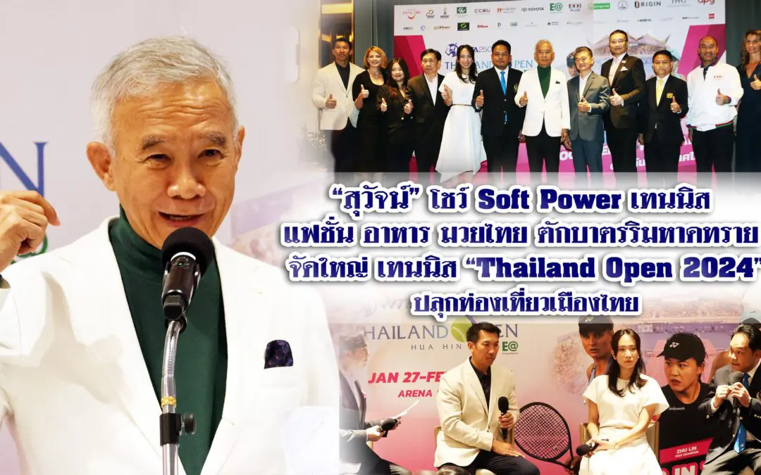 สุวัจน์” แถลงเปิดเทนนิสศึกใหญ่ “ไทยแลนด์ โอเพ่น 2024” ที่หัวหิน ดึงตัวท็อปมาเพียบ ถ่ายทอดสดทั่วโลก พร้อมชวนนักกีฬา ร่วม 4 กิจกรรมไฮไลท์ เดินแบบผ้าไทย ทำอาหารไทย เรียนมวยไทย ตักบาตรริมหาด โปรโมทซอฟท์พาวเวอร์ กระตุ้นการท่องเที่ยวและเศรษฐกิจประเทศ
